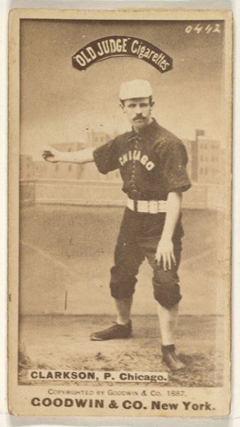 Curator: This is "Sutton, 3rd Base, Boston," a collotype from the Old Judge series created in 1887 by Goodwin & Company. Editor: The sepia tone lends an antique air. It makes the simple baseball diamond setting and Mr. Sutton seem somehow frozen in time. The tight cropping gives him a monumental feel, despite the card's probably very small size. Curator: Precisely. These cards were originally packaged with Old Judge Cigarettes. Their popularity grew rapidly. They reflect a burgeoning American fascination with baseball. But look closely—Sutton here, an athlete celebrated for his prowess, becomes commodified by being tied to tobacco. We must address those intertwined issues. Editor: Interesting point. And from a production standpoint, it shows how the mass production of photographic images shifted with new technologies of reproduction. Think about the number of cards that must have been printed, shipped, and circulated. It must have created unprecedented material demand on a grand scale for print and packaging. Curator: Exactly. What do these cards say about turn-of-the-century America’s idealized athletic figures? It’s an interplay of capitalism, identity, and a yearning for a particular kind of national heroism, constructed during this era of rising nationalism. And who had access to these images and what did this signify? Editor: And speaking about that kind of access, tobacco had its workforce: who labored to create the Old Judge Cigarettes to begin with, who boxed the set of collectibles? Labor issues and how tobacco farming shaped social relations seems important to unpack when studying the legacy of those collectible photographs. Curator: Absolutely. To consider the societal context, this card participates in forming and reflecting dominant attitudes. Who has the right to visibility, whose stories get told and how are very important to consider, as images were and are capable of consolidating privilege or challenging marginalization. Editor: The materiality also evokes other issues. The use of the collotype process hints at labor conditions, global resource supply, as well as distribution chains during this industrial period. It goes way beyond sport celebration! Curator: Spot on. Hopefully, thinking about the intersection between visual representation and material production of those images helps bring fresh perspectives on such seemingly banal ephemera! Editor: For me it's about expanding how we look at objects from a tangible making approach as they inform historical perspectives and bring in societal impacts of images like "Sutton, 3rd Base, Boston.”