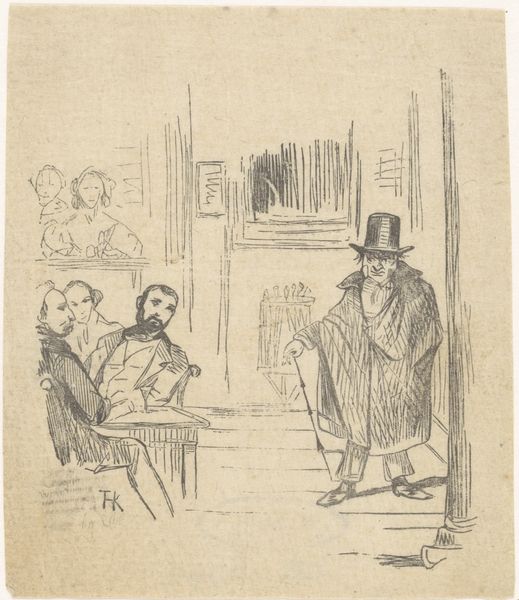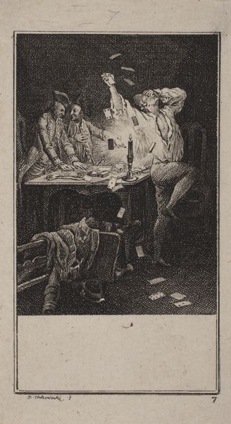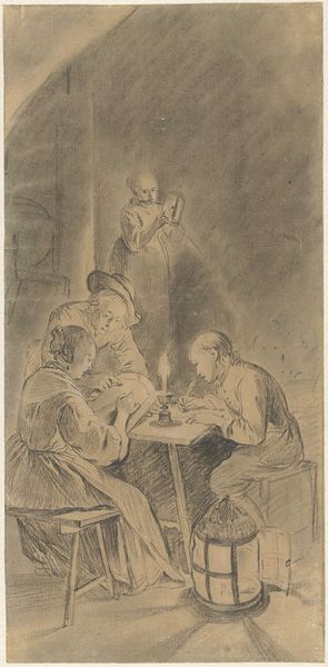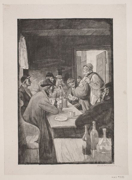 Editor: This is Alphonse Legros' "Supper of the Poor," made with etching, a type of printmaking. The scene is so stark, almost severe, with just a few figures illuminated by candlelight. What social commentary do you think Legros is making here? Curator: It's not just a scene, but a statement. Consider the period – Realism was burgeoning, pushing back against romantic idealization. Legros isn't simply depicting poverty; he's asking us to confront it directly. What power dynamics do you observe in their expressions, in the distribution of light and shadow? Editor: I notice the single woman looking on seems younger than the others. It makes me think about vulnerability and social roles, perhaps? Curator: Exactly! Her gaze, her posture, they all suggest a specific intersectional vulnerability – youth, gender, poverty. How might feminist theory help us unpack the relationships of care, labor, and perhaps even exploitation, represented within this intimate scene? Think about who is seen and unseen, heard and unheard, both within the image and in the larger society it reflects. Editor: So, it's more than just poverty; it’s about who experiences it, and how society structures those experiences. Curator: Precisely. Legros' choice of intaglio allows for those incredibly fine lines, creating a sense of fragility, of lives lived on the edge. By using this technique, he amplifies the harsh realities he wants to convey about the lives of the people. It makes you wonder how effective art can be as a social critique? Editor: I definitely see how examining the historical context reveals so many hidden layers within this seemingly simple composition. Curator: And how understanding the social context can inform and empower our understanding of what we see, so as to provoke more social action, right? It's about looking beyond the aesthetic, towards the socio-political fabric woven into the artwork.