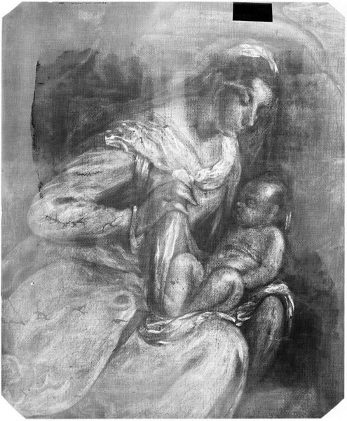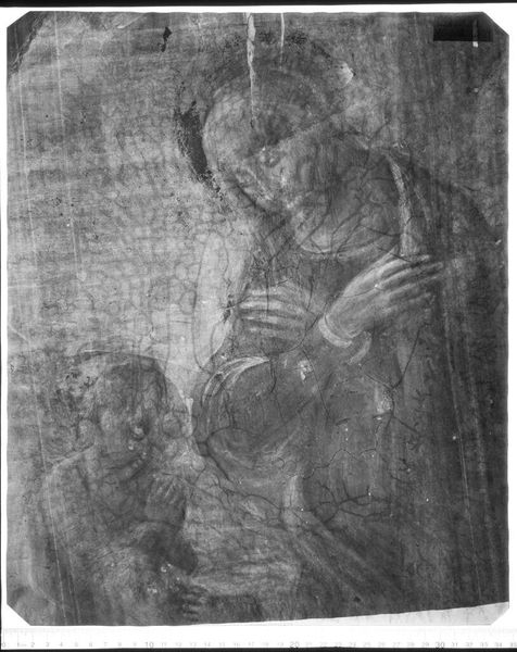 Curator: Here we have an X-radiograph of "Madonna, Child, and St. John" after Bartolomé Esteban Murillo, part of the Harvard Art Museums collection. The film itself measures about 35 by 43 centimeters. Editor: It’s striking how ethereal it appears, almost like a ghostly apparition. The values are inverted, yet the composition remains strong. Curator: Indeed. X-rays reveal the underpainting and alterations, showcasing the artist's process. The Madonna, Child, and young St. John symbolize familial love, piety, and the anticipation of Christ's sacrifice. Editor: The contrast in the child's face is remarkable. The artist’s reworking really stands out, altering the overall composition by shifting values. Curator: Absolutely, the X-ray medium changes our interpretation. We see the pentimenti, the artist’s second thoughts. Editor: So true, allowing us to appreciate the hidden layers of creation. Curator: These glimpses into the artist's process reveal so much! Editor: Yes, providing an unique look at the artist's creation.
