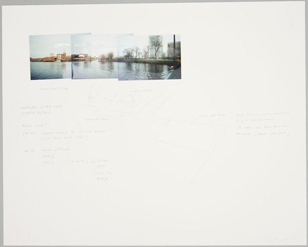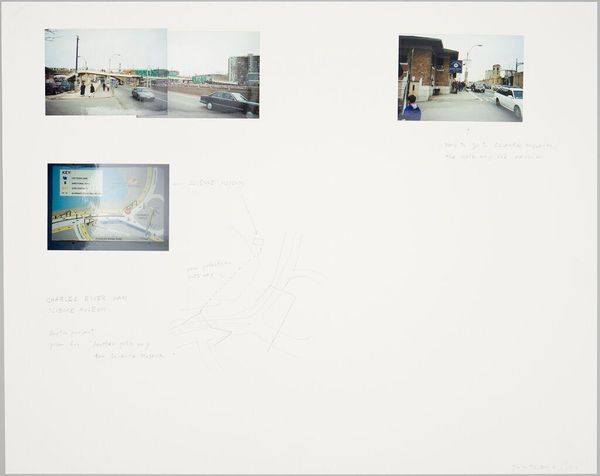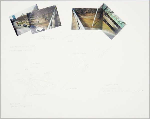 Curator: Tadashi Kawamata's "Sketches No. 10," held here at the Harvard Art Museums, presents a mixed-media composition incorporating both photograph and graphite on paper. Editor: My first impression is of something ghostly, ephemeral. The pale graphite lines seem to barely exist on the page, haunted by that single, stark photograph. Curator: The photograph anchors the sketch; it depicts a wooden structure, perhaps a walkway. The graphite lines, in turn, seem to be an attempt to map out spatial relationships, a symbolic quest to grasp physical space. Editor: It speaks to Kawamata’s larger practice. He uses impermanent materials, like raw lumber, in site-specific installations. These sketches may be preparations for just such a transient work. Curator: Indeed, the sketch becomes a symbolic representation of a possible construction, embodying memory, anticipation, and the potential for transformation. Editor: This piece really emphasizes the provisional and process-oriented nature of art making. It is not just the endpoint of a polished work, but the labor and the planning too. Curator: Precisely. It reminds us that even seemingly simple sketches can carry deep cultural and psychological weight. Editor: Ultimately, the work encourages us to think about how we physically interact with the world, and how we can preserve or transform spaces through the material of art.