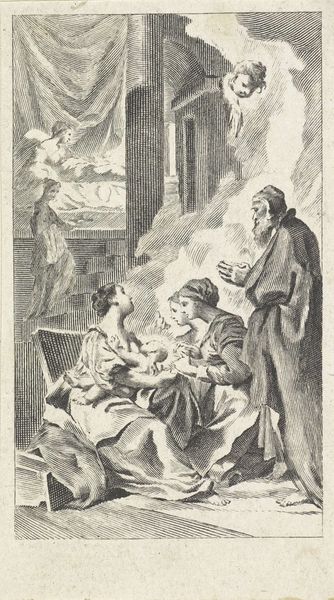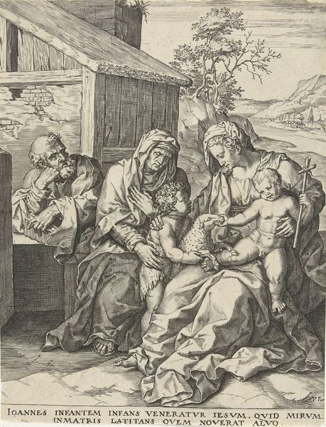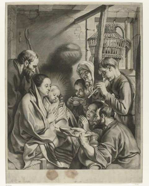 Editor: So, this is “Adoration of the Shepherds” from the 1630s, by Marinus Robyn van der Goes, currently residing at the Rijksmuseum. It’s an engraving… the light almost seems to emanate from the Christ child himself. It has a strangely intimate, almost humble feel, despite the grandeur of the subject. What’s your take on it? Curator: It whispers stories, doesn’t it? Look how Van der Goes positions the shepherds – a motley crue, perhaps, each etched with the lines of life's simple hardships – drawn not to regal splendor but to a quiet, divine intimacy. That humble setting really sets the Baroque drama. Have you ever felt that pull, to be drawn towards something profound hidden in the mundane? Editor: I think so. There’s something really compelling about that humble aspect you’re describing, compared to other more extravagant depictions. It’s not how I usually imagine baroque art, though. Curator: Baroque, for me, isn’t always about the overwhelming grand gesture; sometimes it’s in those little whispers. Van der Goes's conscious decision to create that raw feel, etched so deliberately, speaks volumes. Those sharp lines, you see, it's like truth and humble reality, made visable, bare almost. I wonder how he achieved that! Editor: True! And those faces are so alive. The etching, as you say, really captures that human…realness. Curator: Exactly. And beyond that the play of light and shadow… It's almost as though the light from the Christ child is not only illuminating the scene, but revealing to us, their inner selves. See it now? Editor: Wow! That is so beautiful and, yes, the meaning definitely unfolds even more! It’s been eye opening to really delve into those subtle nuances, making it a moving experience rather than just an intellectual exercise. Curator: That’s art for me, sparking questions, stirring emotions, like a good poem.