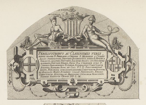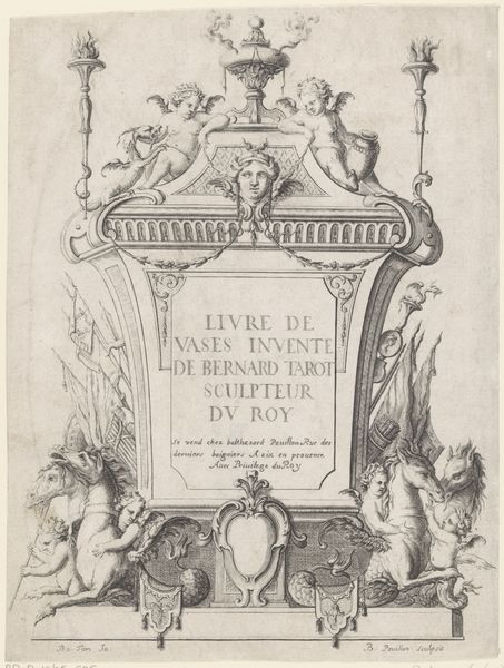 Editor: Here we have "Les Fantaisies de Noble Callot," an etching created in 1635 by Israel Henriet, now residing in the Rijksmuseum. It's this wonderfully delicate image; I love the aged paper. The sketchwork has a certain charm and whimsy. It feels like I’m looking at a title page for some lost collection of fairy tales. What's your take? Curator: It does, doesn't it? I see a collaboration, really. Henriet framing Callot, "putting Callot in light" as the inscription suggests, "by Israel, his friend." I imagine them bouncing ideas off each other in some Parisian workshop... maybe even sharing a glass of something strong? Notice how Henriet uses this frame -- almost architectural, really, doesn't it strike you that way? -- to literally *hold* the title and dedication. It's like he's building a proscenium for Callot's "fantasies." Does it evoke anything else to you? Editor: That's a cool idea of the two working side-by-side! You mentioning that it looks like architecture made me think of theatre and play! Is that something you see, too? Curator: Absolutely. Look at the figures perched atop the frame—they could be stagehands, orchestrating the whole scene. The piece breathes theatricality, right down to the dramatically posed figures flanking the text. Almost as if Henriet is building expectations, setting the stage for the 'Fantaisies' to come alive, maybe something even like a puppet show. The inscription *itself* is almost part of the visual landscape; each line contributing to the overall composition. Editor: I’m going to be picturing stagehands when I read title pages now. This reminds me not to overlook who presents what I’m looking at; someone always puts the artist “in light,” I suppose.