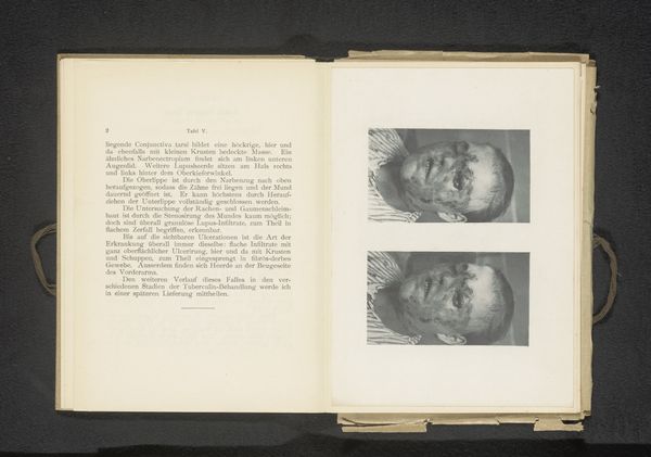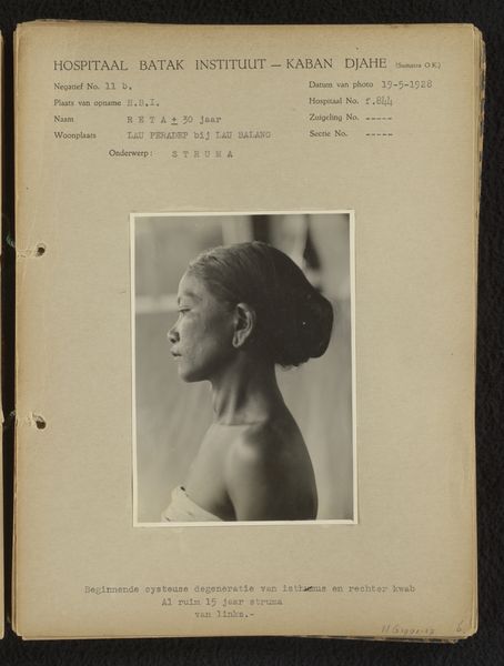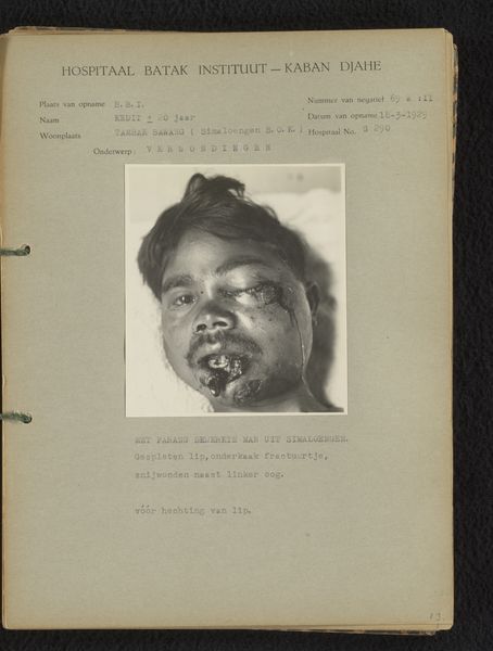 Curator: This black and white photograph, entitled "Wang Carcinoom," originates from the Hospitaal Batak Instituut, dated 1929. Note the portrait style, reminiscent of ethnographic studies. Editor: My initial reaction is one of stark intensity. The harsh contrast amplifies the textures, especially the visible… well, the condition on the subject's face. It’s compelling, and unsettling, all at once. Curator: Indeed. Let's focus on the composition. The subject, named Soekibajak, fills the frame, demanding attention. The lighting emphasizes the topography of his face, revealing both vulnerability and resilience. It bears noting, however, the clinical, near-objective recording of Soekibajak, a tendency shared across visual production made during that era of European Colonialism in Indonesia. Editor: It's more than just documentation though, isn't it? I sense a flicker of something deeper. Look at his eyes, the angle of his head. There's a profound human presence, despite the… circumstance. Perhaps the Batak people viewed this disfiguration and this act of recording with cultural values in contrast to that of the doctors at the hospital, whose perspective might’ve focused solely on the medical aspect. Curator: Semiotically, the image functions on multiple levels. It’s an indexical sign pointing directly to the physical reality of Soekibajak’s condition but also, perhaps unintentionally, functions as an icon signifying human suffering and the complex relationship between medical observation and individual experience. Editor: It challenges us to confront our own discomfort, doesn't it? And, possibly, to see beyond the clinical and recognize the inherent dignity in the person. It feels almost like a call for empathy across the decades. Curator: Agreed. Its formalism is inextricable from its socio-historical context, creating a multilayered reading experience. Editor: Exactly. A single photograph speaks volumes. It’s clinical yet intimate; a slice of history imbued with enduring humanity.