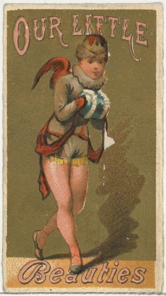 Curator: We are looking at a color print titled "Caricatured Korean, 1 Shot" from the series Coins of All Nations, created around 1889. It was made for Duke brand cigarettes. Editor: The overall composition strikes me as quite theatrical. The figure, rendered with exaggerated features, seems to pose against an almost flattened background. The interplay of colors, while limited, adds a certain vibrancy. Curator: It’s important to understand that pieces like this functioned as promotional material, circulated widely through tobacco products. They offered simplified, often stereotyped, images of other cultures, intended for mass consumption. Editor: Precisely. And within that flattened plane you note, there's the suggestion of dimensionality through shading—see the subtle curves defining the coin and clothing—which contradicts the caricature’s intent to render a simplified view. There's a fascinating tension at play. Curator: Consider also the labor involved: from the initial design to the print production and its insertion into cigarette packs. This image was essentially a commodity, consumed alongside tobacco, both products of industrial manufacturing. Editor: The subject is presented holding a large coin, an attempt perhaps, at symbolic representation of wealth or value associated with a country or people. And yet, it does so through distortion. Look at the disproportionately large ears, the sharp, almost aggressive eyes. Curator: Yes, the "coin" reinforces this. Cigarette companies aimed to legitimize their products by associating them with exoticism. But through cheap, mass-produced images they reinforce the orientalist dynamic and promote imperial fantasies. Editor: A complex layering of image, symbol and manufacture creating its own statement beyond simple exoticism. Its form alone provides such an insight, doesn’t it? Curator: Ultimately, the trade card embodies a significant convergence of artistic expression and economic motivation, reflecting a specific period in history, where these cultural caricatures found a place in our lives through industrial means. Editor: A moment frozen in time—one captured with the tools available during that era of artistic expression, filtered through a particular lens, isn’t it?
