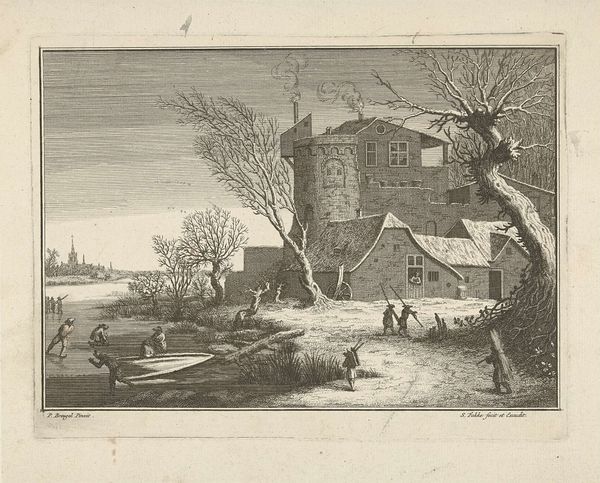 Editor: This etching, “Gezicht in ‘t Gooiland” - or “View in Gooiland” - appears to be from somewhere between 1799 and 1899 and it presents a fairly unassuming landscape scene, with workers breaking stones and a thatched-roof building in the background. I notice how prominent the economic activity is within this representation of the land. What can you tell me about the social implications of such a realistic depiction of everyday rural life during that time? Curator: That's a key observation. Genre paintings like this became increasingly popular in the late 18th and 19th centuries. The rise of Realism, the very movement this is attributed to, coincided with significant social and political upheaval. Notice how the artist refrains from idealizing the labor. The focus isn't on heroic figures or grand narratives, but on the daily grind of ordinary people. Why do you think the art market became more interested in the “everyday?” Editor: Maybe the middle class became interested in buying representations of themselves. Art no longer needed to be a statement of power or nobility. But does including these regular activities somehow glorify them, or is it purely documentary? Curator: That’s an interesting question, and it depends on how the work was received at the time, something not readily apparent from looking at the etching itself, but understanding its place within exhibition culture gives insight to it. This landscape with labor invites viewers –likely urban and affluent—to contemplate rural life. What are their political positions, when viewing the lower classes? Pity? Celebration? Perhaps an urge to support the community portrayed? The genre, and its exhibition, is doing that political work. Editor: That’s fascinating. So, understanding its original context is vital for unpacking what this seemingly simple etching is really communicating. I appreciate seeing the way history, class, and even marketing come into play in what looks like a simple picture. Curator: Exactly! The seemingly straightforward image becomes a window into a complex web of social and economic relations. The artist isn't just showing us a landscape; they're showing us a society in transition and a market emerging.