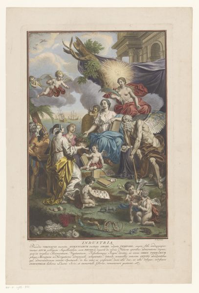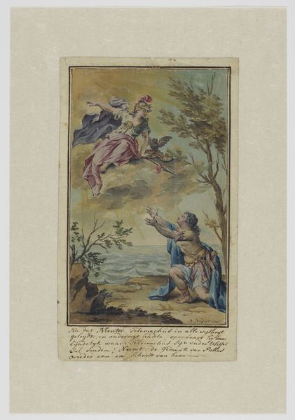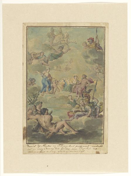 Curator: This watercolor painting, dating from approximately 1719 to 1775, comes to us from the hand of Rienk Keyert. It is currently housed here at the Rijksmuseum. The title? "Venus Entreats Neptune to Prevent Telemachus Landing on Ithaca." Editor: My goodness, it's… intense. A slightly sea-sickening baroque swirl. And is that Neptune driving a chariot pulled by seahorses with *legs*? It's strangely endearing in its over-the-top drama. Curator: Indeed! It depicts a pivotal moment, doesn’t it? Note Venus, high in the sky, her plea to Neptune central to the narrative from Homer’s Odyssey. Consider Neptune's pose, trident held high, ready to unleash his watery wrath. This isn't merely a scene; it’s a convergence of power dynamics. The cherubs as well! They have the symbolism of love. Editor: Power, yes, but also that feeling of… inevitability? The colour palette, washed blues and greens, lends an ethereal, almost melancholic quality. I see Telemachus as more of a pawn than a character with actual power to change anything here. Curator: The colours here can bring on certain feelings, though one thing remains, doesn’t it? We're not just witnessing a divine intervention; we're privy to the emotional undercurrents shaping human destiny. Keyert captured that struggle beautifully. Do you see that inscription on the lower portion of this piece? Editor: I do see it, now. Its funny how different cultures will often change small elements when depicting classical images; its something I really enjoy spotting. It’s almost comforting to find the shared humanity. This Baroque dance continues even now in a way; a story retold and refelt throughout the ages. Curator: A testament to art's enduring capacity to both capture and reimagine these myths that run deep. It seems as though they may change over the centuries, but still manage to feel very real. Editor: An invitation to look beneath the surface, beneath the myth...to where the tides of human drama constantly crash. Thanks for pointing out such beautiful art.