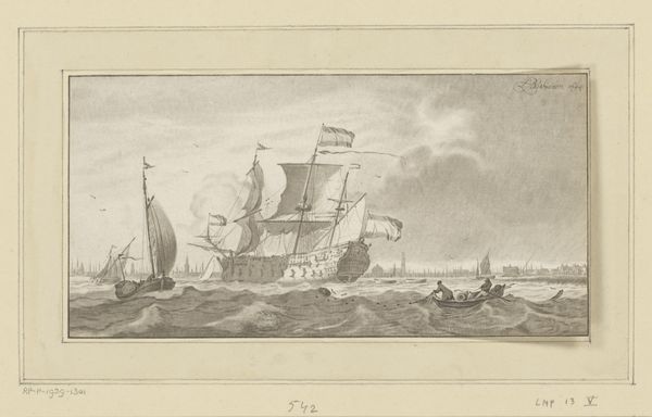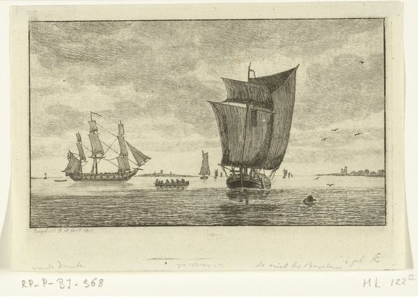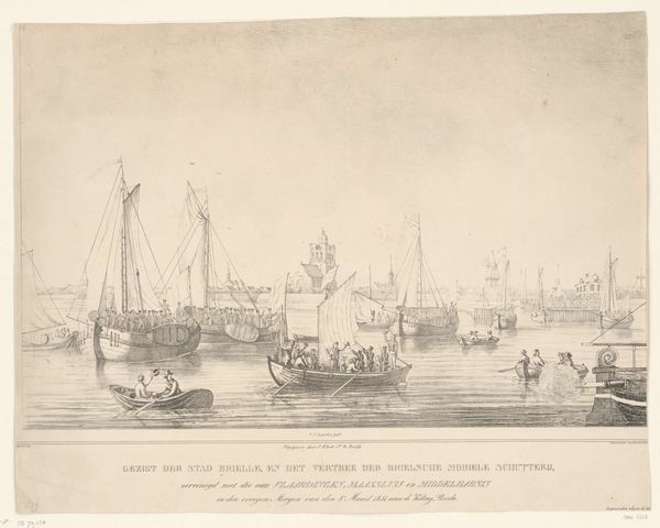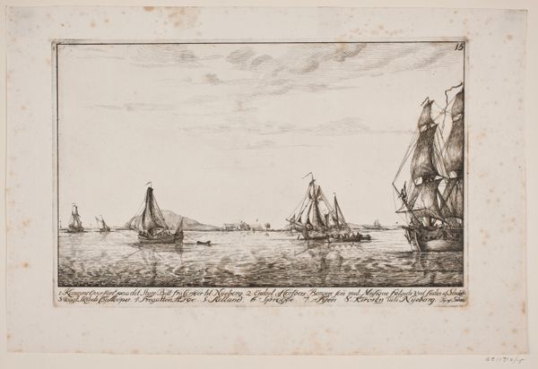Editor: So, this is “View from the Scheldt on the Sint-Michielskaai in Antwerp” by Egidius Linnig, created in 1853. It's an etching, and right away, it makes me feel… peaceful, almost a little wistful. There's something very serene about the ships and the hazy buildings. What do you see in this piece? Curator: Wistful, yes, exactly! For me, it's the light. How Linnig uses etching to capture this almost dreamlike quality of the water and the sky… it's really captivating. It's Antwerp in the mid-19th century, a major port city, bustling, but he's found this moment of quiet reflection. Do you notice how the architecture is detailed, yet softened? Editor: I do! It's not a photograph, it feels more… imagined, maybe? Almost romanticized, which I guess fits the era. Curator: Absolutely! And it speaks to something deeper, doesn't it? These weren’t just documents, but reflections of a particular way of seeing the world. Look how he emphasizes the relationship between humanity and nature. It isn't about conquering but being part of that vista. Editor: It's interesting that he included those everyday details – the barrel floating, and the fishing net – yet, the overall feeling is still grand and serene. Curator: Precisely! It is romanticism through realism. I'm curious; does seeing it like this change how you feel about it? Editor: Definitely. It adds layers, makes me appreciate the skill in blending reality and… well, a feeling, more than just a view. Curator: And that, my dear friend, is the magic of art isn’t it?