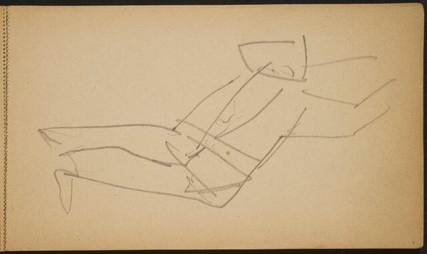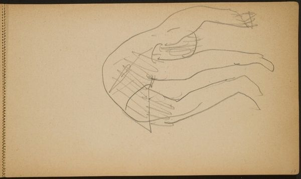 Curator: I'm struck by the fragility of this pencil drawing. It’s entitled "Akrobat in der Brücke und weitere Figur (Backbend with Onlooker) [p. 3]" by Max Beckmann. Editor: There's something unsettling in its simplicity, almost haunting. The bare minimum required to suggest figures in tension and observation, isn't it? It looks like an intimate glimpse into someone's working notebook. Curator: Yes, it is! Its materials tell a story. We see a modest pencil sketch, hastily rendered on paper; a readily available, easily transportable means for capturing immediate thoughts or observations. Editor: That’s so true. The casual medium makes you think about where this notebook went, and why Beckmann recorded these almost furtive studies of bodies under stress. Is this a prelude to a larger project? Where do acrobatics fit into his oeuvre, generally speaking? Curator: He often looked to the circus as a site of spectacle but also precarity. Here, it looks like he is more invested in the construction of the figures as unstable masses within space than an event, specifically. The way he has mapped the spatial volume occupied by these hands is striking. Editor: Thinking about the role of museums here too—I wonder, what purpose does it serve for us to frame something so ephemeral? Isn't its very charm the immediacy? Its function seems entirely changed when removed from its intended private viewing and set under museum lights. Curator: Perhaps by highlighting the labour and processes, we can demystify the "genius" of the artist and focus on their methods. The sketch embodies a unique form of work itself; and, by studying his artistic procedure, we get closer to what preoccupied the artist in his day-to-day practice. Editor: A fascinating reframing indeed! Thank you, it has changed my understanding of the work on display, and by acknowledging it’s making, the piece offers a commentary about how we come to see. Curator: Thank you, I have a greater understanding now of how an artwork and venue intersect to create ever-changing contexts.