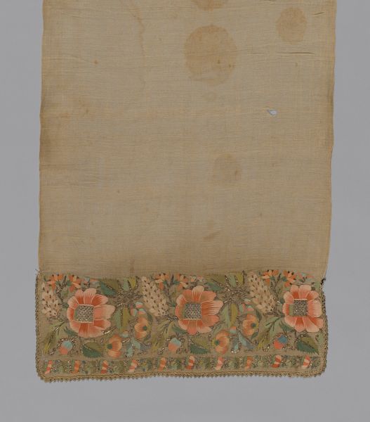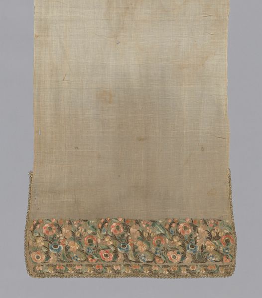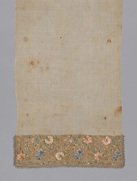 Editor: Here we have "Towel," an anonymous textile artwork dating back to between 1850 and 1900. It's on display here at The Art Institute of Chicago. The combination of the delicate weave and the elaborate embroidered floral border gives it such a lovely, almost sentimental feel. What sort of symbolic weight do you think we can attach to a piece like this? Curator: That’s a wonderful way to describe the feeling it evokes. It seems, on the surface, to be purely decorative, but objects associated with the body, even indirectly, carry intimate stories. How does it alter your interpretation to know that it’s a towel? Does it speak of domesticity? Ritual? Editor: Definitely domesticity, it brings thoughts of family to mind. The care and effort involved in creating the floral pattern suggests a labor of love, maybe prepared as part of a trousseau? Curator: Precisely. Consider the flowers themselves – can you discern what kind they are? Could these choices have significance beyond mere aesthetic appeal? The rose, for example, traditionally represents love, but also secrecy. Is there something concealed within this domestic image? The cultural memory embedded in even these humble textiles… Editor: I hadn’t thought about it that deeply before. Now I am wondering, did the flowers used to decorate the towel carry different meanings in that time? Curator: Undoubtedly. A rose may speak to love or beauty. Lily represents purity and hope. Each tiny addition to the fabric represents not only care, but a coded language, echoing shared knowledge. Even now, without perfectly knowing its origins, don't you feel like the work communicates the importance of tenderness in domestic life? Editor: I do. The towel isn’t just an object; it's a whispered story passed down through generations. I am never going to look at textiles in the same way. Curator: It transforms everyday objects into powerful witnesses. This textile work, therefore, becomes an archive in threads.