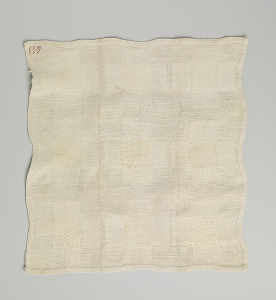 Editor: This is an intriguing 19th-century textile, simply titled "Shawl," currently at the Minneapolis Institute of Art. The material design is eye-catching, with those repeated paisley motifs and clean central space. What can you tell me about it? Curator: It's crucial to consider the conditions under which this shawl was produced. The uniformity of the pattern, while aesthetically pleasing, points to the mechanization of textile production. Were these made by hand? Where? How were these made by artisans? If so, we need to question if we are romanticizing craft while ignoring labor exploitation. Editor: I hadn't thought of it that way. The detail made me assume a hand-crafted origin, not the result of industrial manufacture. Curator: Indeed. Shawls like these often masked the true nature of their production behind a veneer of elegance and exoticism, obscuring the reality of factory labor and global trade networks. Considering the social context helps unveil the intricate story woven into this textile. It also appears to have some level of bleaching on what would have probably been a darker material; where did they get these resources? Were these people contributing to colonization by demanding resources from afar? Editor: That makes me see the shawl in a totally new light. Instead of a pretty object, it is also a testament to the socio-economic context from which it came. So, how would this knowledge reshape my viewing of decorative arts moving forward? Curator: Now, every material becomes a point of inquiry. What is this made of, where, by who? Thinking about things as simple as dye can tell the true, material origin. Editor: I’ll definitely approach these kinds of pieces with more critical curiosity now. Thanks for sharing your insights.