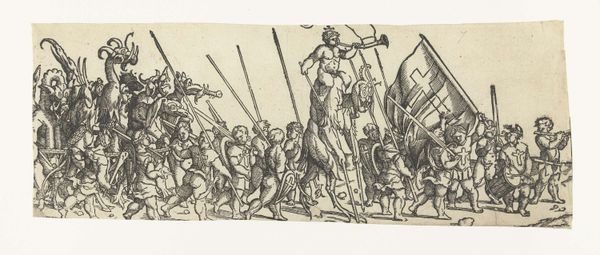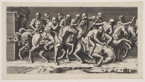 Editor: This is "Auxiliary Soldiers and Lancers" by Antoinette Bouzonnet-Stella. It's a striking print showing a procession of Roman soldiers, and there's a real sense of movement in the composition. What strikes you most about this piece? Curator: The depiction of military power is always a political statement. Consider the context: a female artist representing Roman soldiers. Is she glorifying empire, or perhaps subtly critiquing the patriarchal structures inherent in military power? What does this image suggest about the role of women in shaping historical narratives? Editor: So, you're thinking about the artist's perspective and how her gender might influence the work's interpretation? Curator: Precisely. It compels us to question whose voices are amplified in historical accounts and whose are marginalized or silenced.
