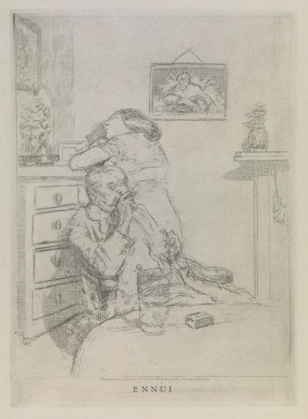 Bramine Hubrecht made this drawing of A. Grandmont and a woman with a book using graphite on paper. The texture of the paper is visible beneath the marks of the graphite, creating a sense of immediacy. Graphite, of course, is pure carbon, formed under immense geological pressure. Here, though, it has been put to a lighter use, recording a fleeting moment. The artist has quickly built up tones to suggest the forms of the two figures, capturing their postures and the fall of light on their faces. Hubrecht’s use of a relatively inexpensive material like graphite allowed her to produce this image quickly, likely as a study or personal reflection, rather than a commission. The marks left behind show her process. In this case, the drawing functions like a snapshot - a reminder that even the simplest of materials can be used to capture a complex human experience.