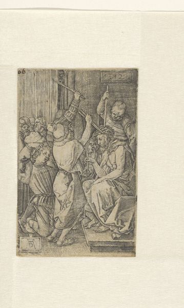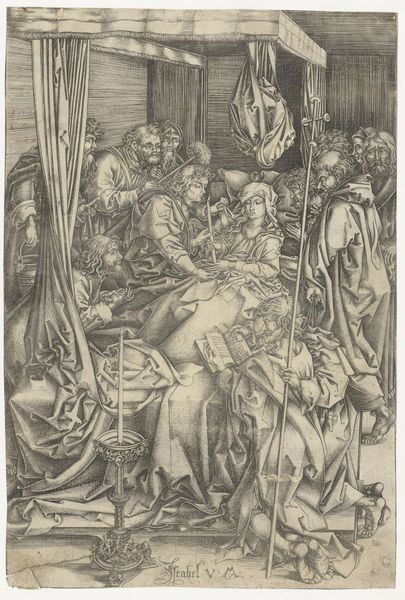 Editor: Here we have "Adoration of the Magi," an anonymous drawing from the Renaissance, made using ink, chalk, and woodcut on paper. It looks so intricate! All those figures are wonderfully detailed and layered together. What strikes you most about the composition? Curator: I am drawn to the line work and its capacity to create spatial depth. Note how the artist utilizes hatching and cross-hatching techniques to define form and generate tonal variation, crafting an atmospheric perspective. How does the use of line contribute to the overall mood? Editor: I guess it makes it feel more serious, almost like a very detailed study or blueprint because it's black and white, with so many tight lines. It really directs your eyes through the crowd. Are there any specific elements of design that stand out? Curator: Yes, consider the architectonic structure in the background, starkly contrasted with the organic draping of the figures' garments. The angularity inherent within the architectural elements juxtaposes gracefully with the curvilinear qualities seen in the clothing. What effect does this contrast generate, aesthetically speaking? Editor: That’s a really interesting point – it makes it feel balanced, yet a little unsettling at the same time, with the architecture feeling incomplete but so rigidly structured. The flow of the robes grounds it, I think. I never noticed that! Curator: Precisely! And it’s through these formal devices that we begin to understand the intent behind the construction of this image. Studying the relationships among elements can offer considerable insight, yes? Editor: It really does. I was just seeing it as one image before. Thanks for walking me through the specifics; I appreciate it! Curator: Indeed. By engaging with the artwork's intrinsic qualities, we illuminate its very essence, allowing it to speak directly to us.