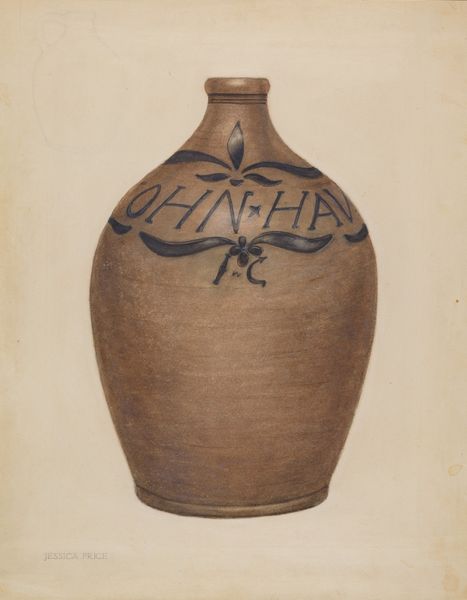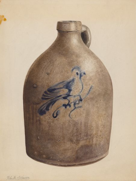 Frank Fumagalli made this Jug from watercolor on paper, and you can just tell how much he enjoyed the process. I mean, look at the way the brown paint pools and blends, creating this soft, almost hazy effect. It’s like he's not just painting a jug, he's painting the *idea* of a jug, the memory of a jug, you know? The color, that earthy brown, it’s not just one note, it’s a whole chord. It's got a subtle mix of warm and cool tones that give the jug form and volume. Notice the little details, like the darker lines around the lettering which give it a 3-D effect. Fumagalli’s work reminds me a bit of Giorgio Morandi, the way he could find endless beauty in simple, everyday objects. But where Morandi is all about subtle variations, Fumagalli has a kind of straightforward charm. Ultimately, the painting invites us to slow down, to appreciate the simple things, and to find beauty in the everyday.