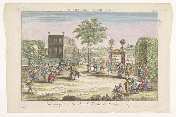 Curator: This is an 18th-century watercolor titled "View of the Château de Noisy," here at the Rijksmuseum. Editor: It has a curiously stage-like quality, almost like a backdrop for a play. The high horizon and meticulously rendered architectural details create a sense of detachment. Curator: That's interesting. Given its Rococo styling, we can see that the Chateau itself symbolizes the aristocratic society that defined the era—their opulent lives visually reinforced. Editor: True, but I see more. Notice how the artist rendered the landscaping. All this meticulous architecture couldn't be realized without material extraction, enslaved labor, deforestation for the land itself. That highly manufactured vista carries a high, if invisible, cost. Curator: A relevant point! And in many ways, we might then understand the work itself—made using paper and watercolor—as itself being intertwined with systems of resource extraction and the art market as a whole. We might see its rococo style, in our moment, not as decorative, but as connected to material exploitation. Editor: Absolutely. Rococo celebrated elegance and leisure, but for whom? The finely dressed figures strolling through the gardens enjoyed privilege made from unacknowledged exploitation. And consider that watercolor wasn't always seen as high art, its materials seen as inexpensive or utilitarian. Curator: Precisely, situating art objects within broader frameworks, thinking critically about the intersections of gender, race and class help reveal complex social dynamics—even those embedded within seemingly placid scenes. It's a work offering rich perspectives that shift across time. Editor: Indeed. What might appear at first glance to be merely a quaint architectural rendering ultimately reveals complex networks of material and power relations. It reminds us that even seemingly decorative works have something meaningful to say about production and making.