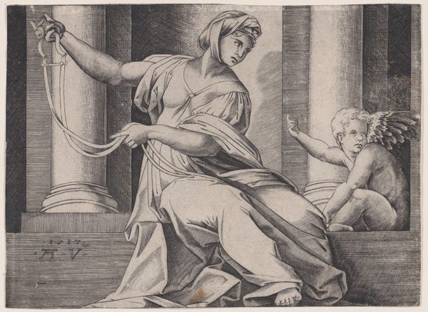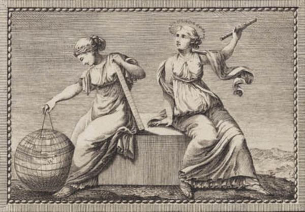 Editor: This engraving from 1771-72 by J.F. Clemens, titled *Urania og Gæa sidder på en firkantet stenblok,* features two classically draped figures, one with a globe and compass, the other holding a telescope. I'm struck by how these symbols of knowledge and exploration are presented through an allegorical lens. What story do you think this piece is trying to tell? Curator: It's a fascinating encapsulation of Enlightenment ideals. Consider the historical context: the late 18th century was a period of burgeoning scientific inquiry, alongside powerful aristocratic institutions. The print blends Neoclassical style, idealizing ancient Greece and Rome, with Baroque dynamism in the flowing robes. Given that it's housed in the Statens Museum for Kunst, it was clearly intended for a relatively public consumption. Who do you think the audience was, and what messages might they have taken away from this imagery? Editor: Well, being a print, perhaps a wider audience beyond the wealthy elites. I imagine it was to make a statement on how scientific advancements can shape public perceptions about institutions and their places in the world. Curator: Precisely. The figures, Urania and Gæa, representing astronomy and Earth, highlight a societal investment in these disciplines. The imagery connects progress in mapping the globe and cosmos with idealized female forms, symbolizing knowledge itself. The placement in a public collection implicates the museum as a vehicle for the state’s support for, and validation of, this intellectual pursuit. Does understanding the potential historical context influence your initial perception? Editor: Definitely. Seeing it as more than just a decorative engraving but rather a reflection of societal values at the time makes me appreciate its complexity. Thanks for shedding light on it! Curator: My pleasure. Reflecting on these dynamics helps us understand how artistic production operates in conjunction with public institutions and broader cultural forces.