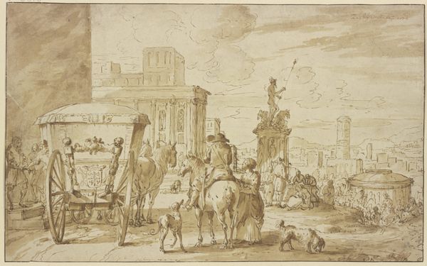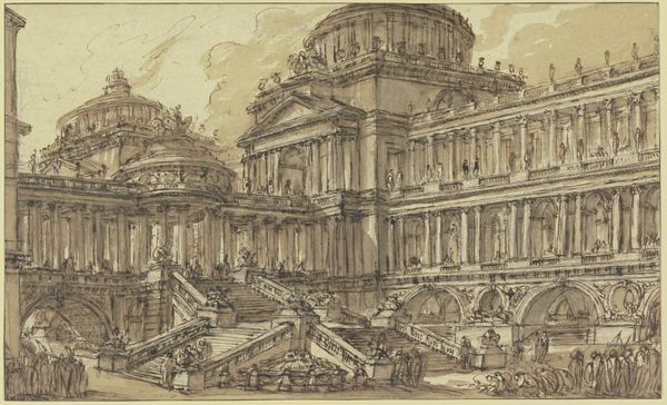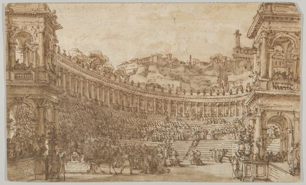 Curator: Jacob van der Ulft rendered this drawing, "Gezicht op een stadsplein vol mensen, waar een man wordt bekroond"—or "View of a city square full of people, where a man is crowned"—sometime between 1637 and 1689, using ink. Editor: It’s undeniably Baroque, a real feast for the eyes. I’m immediately drawn to the interplay of light and shadow, even with the monochromatic ink wash, creating a sense of depth and drama. It looks as if the artist paid really close attention to the material qualities of urban life. Curator: Van der Ulft was quite fond of architectural studies. Think about how the ink drawing medium lent itself well to replicating architectural plans as well as lively genre paintings—an accessible means for him to build a career based on craft and technical skill. He combined both here, incorporating a lively historical moment. Editor: Indeed. Beyond the drawing’s masterful technique, one has to wonder: Who is being crowned, and what sociopolitical forces are at play here? It really strikes me, the theatrical display of power and celebration amidst the backdrop of monumental architecture. Is this an endorsement, or perhaps a subtly critical comment on the relationship between power, public spectacle, and urban space? I note the varied reactions across the social classes. Curator: Given that van der Ulft never traveled to Italy but painted many scenes in the Italian style, we might assume he wasn't overly invested in verifiable historical or social context. The labor was more likely focused on acquiring perspectival skills and in employing drawing as a kind of visual record that held intrinsic value and aesthetic appeal. Editor: I can see your point; at the same time, consider how the image reproduces social and political hierarchies so readily, whether deliberately or not. What can its consumption teach us about the relationship between artist, patron, and subject during the Dutch Golden Age? Curator: Ultimately, the ink and the technique employed by van der Ulft speak to an expanding and lucrative art market catering to the era’s obsession with both the classical world and views into contemporary society. Editor: And it's a compelling reflection on urban spectacle. There's a quiet intensity in how the scene unfolds, which for me sparks essential questions about cultural and social identities throughout the ages.