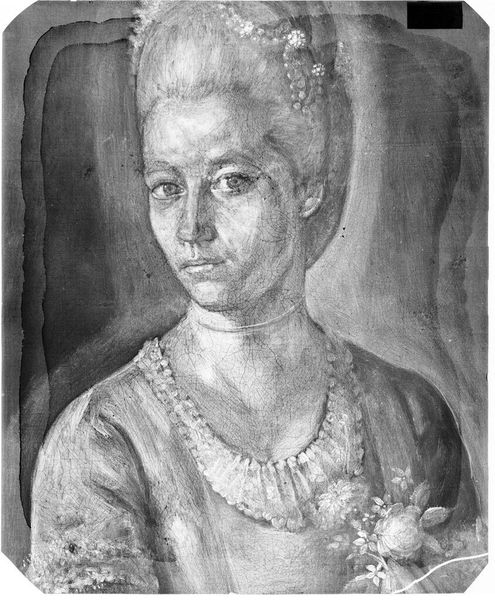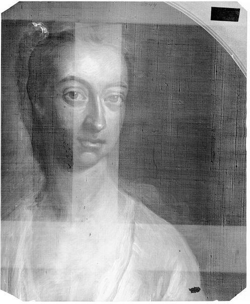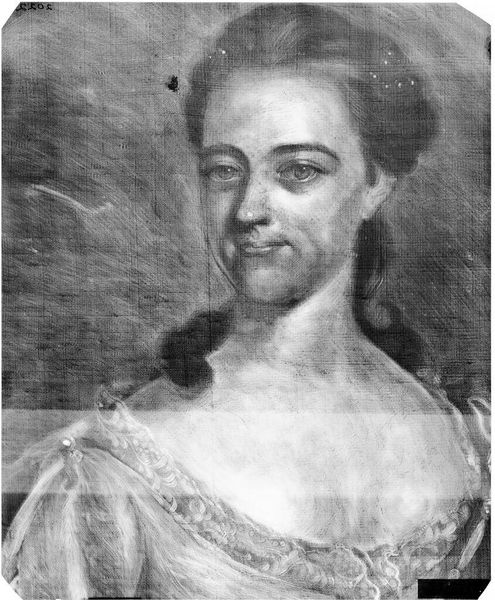 Editor: This is an X-radiograph of John Singleton Copley's "Mrs. Joseph Warren (Elizabeth Hooton)". It looks so fragile and ghostly. What can you tell me about this work through a formalist lens? Curator: The radiographic process lays bare the structure. Consider how the composition—the subject's bust framed tightly—transforms when viewed solely through material density. The lines, the texture of the canvas, become the dominant visual elements. Editor: So, it’s less about the person and more about the physical makeup of the art object? Curator: Precisely. The stark contrast reveals the artist’s process, the very bones of the artwork. We can analyze its structural integrity, the layering of paint, without the distraction of representational content. Editor: I see it now! It’s like an abstract study of form, revealed by science. Curator: Indeed. And it compels us to reconsider what constitutes the essence of a painting.