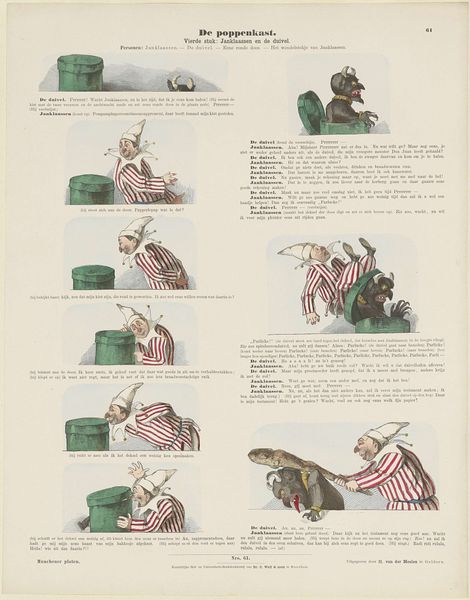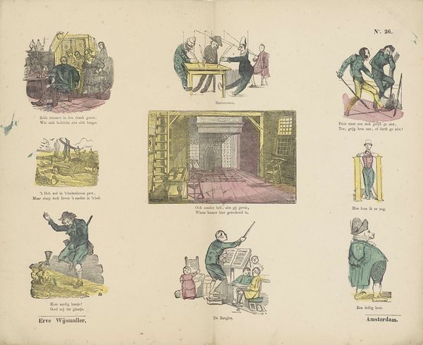 Editor: This piece is titled "Verschillende Taferelen," created in 1873, by De Ruyter & Meijer. It appears to be a page from a sketchbook, filled with a series of small, whimsical scenes. The overall effect is quite charming. What do you see in this work from a formal perspective? Curator: The interest here, first and foremost, resides in its composition. Note the deliberate arrangement of vignettes on the page. How does the structure influence your reading of individual scenes? Editor: Well, I hadn't thought about that initially. Now that you mention it, there’s a grid-like structure. Each scene is compartmentalized, almost like a comic strip without clear narrative connections, despite being placed alongside each other. Curator: Precisely. Observe how the limited color palette—the subdued blues, browns, and greens—unifies the diverse subject matter. Does the consistent application of color facilitate a sense of coherence across the entire work? Editor: I think it does. It prevents the eye from being overwhelmed and allows each scene to breathe despite the page being so full. Curator: Indeed. Consider also the application of line. Notice how the artist employs a consistent linework across the vignettes. Does this linear precision impact the texture and form depicted in the artwork? Editor: Absolutely. The thin lines create a sense of detail without adding bulk and the forms almost feel sketched out quickly. They contribute to a lighter, almost ephemeral, feeling. Curator: So, we have the page layout and colour, the interplay of form and function that suggests a particular artistic purpose, an almost pedagogical approach even in its levity. This exercise has highlighted the necessity of examining beyond the initial impression. Editor: I agree. Looking at the structural choices of colour and the repetition in the linear elements provides greater nuance to this sketchbook piece. Thanks for the insight!