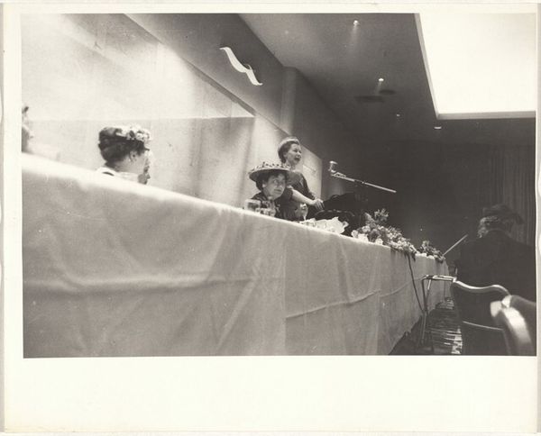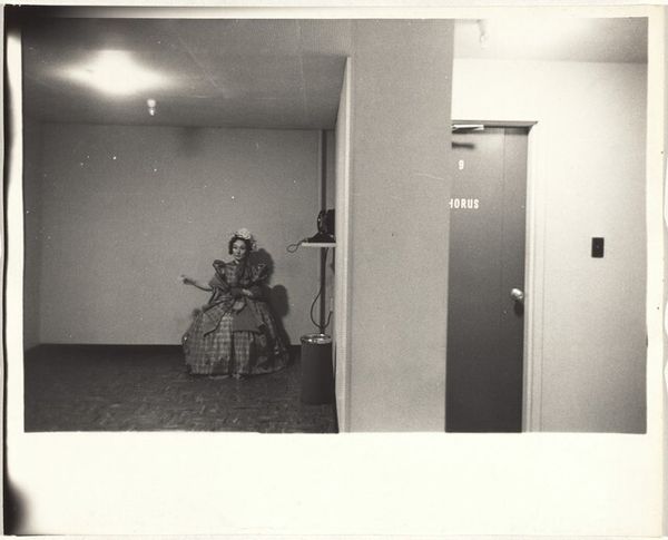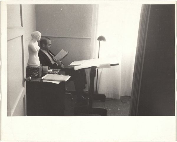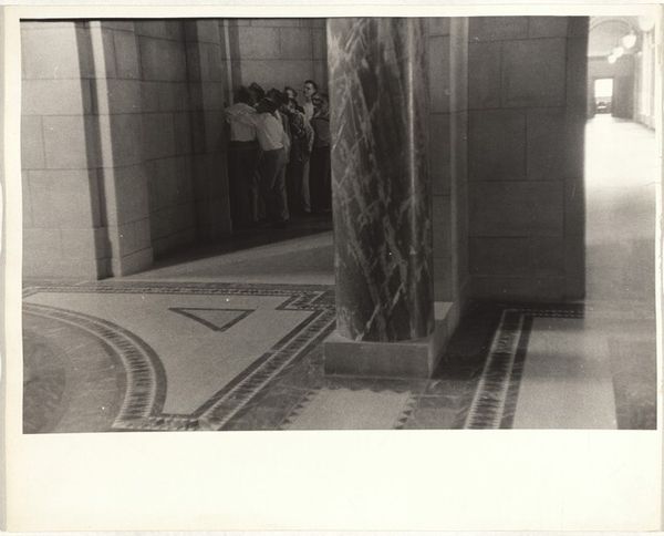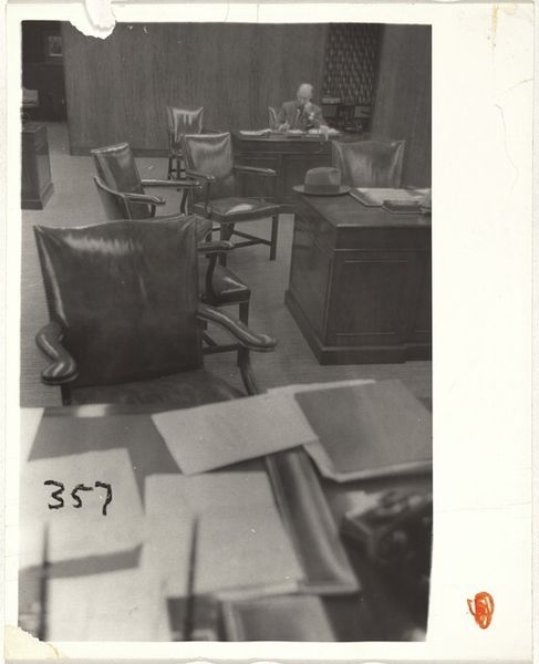 Curator: Robert Frank’s photograph, “Bank Office--Houston, Texas,” taken in 1955, offers us a seemingly mundane glimpse into an everyday financial transaction. Editor: It’s strikingly unsettling, isn't it? The composition is heavy, almost oppressive. The blank stare of the person on the left, seemingly a clerk, only adds to the feeling that something is deeply amiss beneath the surface of this scene. Curator: Well, consider that this image comes from "The Americans," Frank's seminal project that captured a somewhat brutal vision of the U.S. in the mid-1950s. It wasn’t necessarily embraced upon initial release, since it challenged many postwar social orthodoxies. Editor: Precisely! Looking at it through a contemporary lens, I’m immediately drawn to questions of power, race, and economic disparity. We have what appears to be a white banker in conversation with a Black patron. Curator: It's tempting to focus on race immediately, but consider also Frank's interest in how institutions – banks, in this case – shape individual interactions. It may not be race specific, but about access to resources. Frank's photographs challenge the supposed post-war boom, right? Editor: That’s valid, but you cannot divorce the racial context from it. Who has access to power, resources, and representation? I think Frank, even if unconsciously, highlights those fractures. That blank wall seems symbolic too; an almost impenetrable institutional barrier. The subjects in the frame remind us that equality was just a notion. Curator: It's undeniable that Frank's approach challenged norms of photography, influencing generations. He moved away from overly composed shots to embrace a looser, more spontaneous feel, even with blurred figures like the employee on the left, with a sense of authenticity that other pictures often fail to achieve. Editor: I find myself pondering the gaze that Frank as a Swiss Jew brings. “The Americans” captures a unique perspective as a foreigner looking at what he observes, in order to question it, and hopefully generate a positive social response. Curator: A potent image that’s hard to walk away from without deeply pondering the power of the ordinary, rendered with starkness and uncertainty, wouldn't you say? Editor: Definitely! The work urges a sustained critical examination, urging dialogue that includes power, visibility, race, and gender and the many dynamics, that may still ring too true to present social realities.