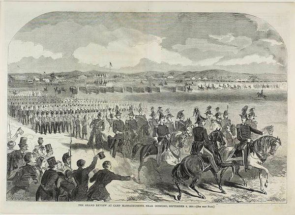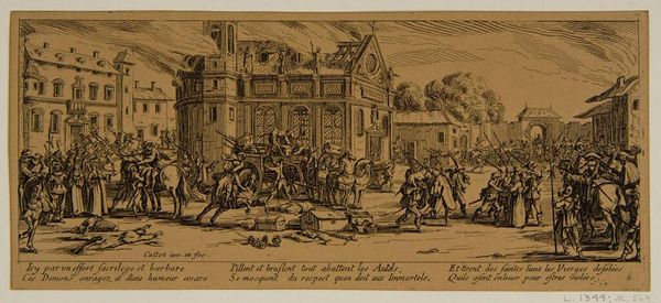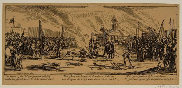 Curator: Editor: Here we have Jacques Callot’s "The Army Preparing for Battle," a print from the early 17th century. It's incredibly detailed for such a small work, showing the sheer scale of military preparation. What do you make of it? Curator: Well, consider the etching process itself. Callot innovated etching techniques, hardening his plates to allow for finer lines and more impressions. This speaks to a burgeoning market for such imagery, disseminating militaristic ideals and the visual spectacle of war to a wider audience. What does the availability of these images say about 17th-century society? Editor: So, the printmaking process facilitated the spread of these militaristic images, almost like propaganda? Curator: Precisely! The means of production shapes its consumption and influence. This wasn't just art; it was a commodity intertwined with the political climate and social values of the time. Editor: That’s a very different way to look at it! Thanks.