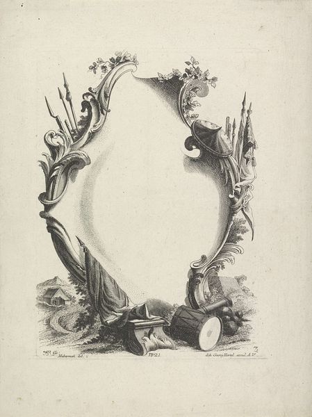 This is Anthonie van den Bos's "Lauwerkrans", made with pen in grey ink. The artwork immediately strikes you with its simple yet profound form: an oval laurel wreath, meticulously rendered. The wreath is not just a decorative element, but a symbol, its circular shape suggesting wholeness and continuity. Two stems are crossed at the bottom. Van den Bos's use of grey ink adds a layer of complexity. The grey tones lend the wreath a ghostly presence, which destabilizes our understanding of the artwork's meaning and form. The wreath isn't solid, but seems to hover between presence and absence. Consider the cultural codes embedded within this image. Laurel wreaths have historically symbolized victory and honor. By presenting it in grey ink, van den Bos seems to play with these established meanings. It invites us to question fixed notions of triumph, suggesting that honor and victory may be more elusive.