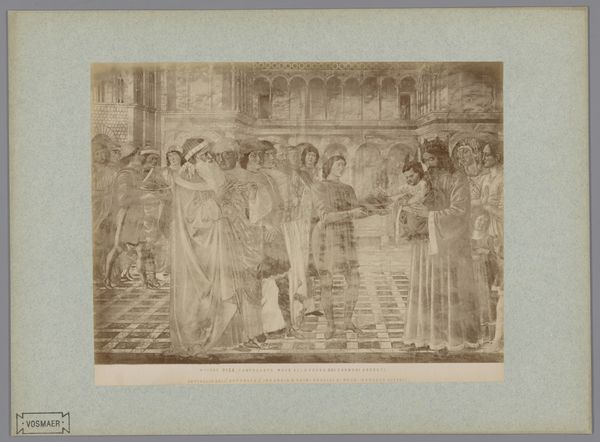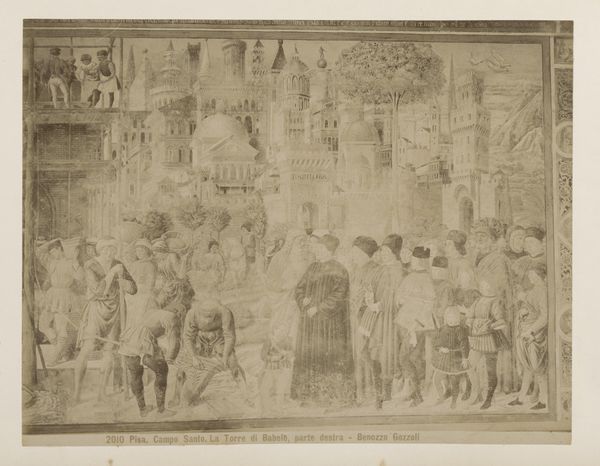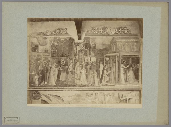 Curator: This photographic reproduction from the late 19th century by Fratelli Alinari captures Andrea da Firenze’s fresco, “The Temptation and Persecution of Renier van Pisa,” originally located in the Camposanto in Pisa, Italy. Editor: My first impression is one of faded grandeur, that warm sepia tone lending a distant, almost dreamlike quality. The composition seems meticulously arranged, despite the limitations of the photographic technology of that era. Curator: Indeed. These early photographs of artworks served an essential function in disseminating knowledge about art and architecture to a wider public. Prior to widespread travel and colour printing, these prints provided a crucial visual record. Andrea da Firenze's frescos played a crucial part in defining civic pride and were an early model for communicating power, something further echoed in this photorealistic print. Editor: I notice the figures are placed deliberately in a structured pictorial space. Even in the faded print, one can see how Florentine applied principles of harmony and balance. The organization of figures in clear horizontal registers creates a visually pleasing and legible narrative. Curator: It’s important to note the fresco’s subject matter as well, which concerns Renier of Pisa, who dedicated his life to prayer, but was frequently persecuted. That narrative in itself communicates a set of political as well as moral values relevant to Florentine society. The proliferation of the image through these photographic prints emphasizes these stories for audiences outside Pisa itself. Editor: Yes, absolutely, that emphasis through visual cues contributes so strongly to that message of civic pride. Even details, such as drapery, are rendered with such attention, adding a layer of realism. Curator: This form of photographic reproduction effectively democratized access to significant artistic treasures. While it may lack the vivid colours and scale of the original, it extends the cultural influence beyond the physical location of the fresco itself. Editor: Exactly, and even now it grants access in a certain way. Looking at this image encourages me to want to know about its context. The way this fresco, now a photograph, communicates across time, it offers viewers the chance to contemplate beauty, faith and legacy. Curator: Absolutely. Its impact remains meaningful, as both a historical document and a testament to the power of visual narratives.