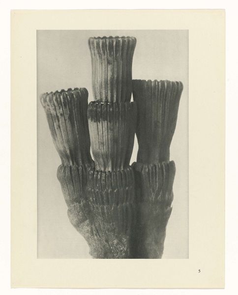 Curator: I'm struck by the strange elegance of this work. Editor: You’re not kidding! It reminds me of some bizarre ceremonial object, or maybe a prop from a lost surrealist film. What are we actually looking at here? Curator: This is Karl Blossfeldt’s “Plantstudie,” created around 1928. It’s a photograph, part of his larger project to document plants using close-up photography as almost architectural studies. Editor: Architectural, yes! Nature as blueprint. I see that now. And in stark black and white. It really strips the plant down to its basic forms. It feels almost… alienating. Did Blossfeldt mean for them to feel this way? Curator: I believe Blossfeldt’s motivation was driven by the educational and design reforms occurring in Germany at the time. He was interested in revealing the underlying geometric structures inherent in nature, perhaps as models for art and industry to emulate. He used photography to elevate these overlooked botanical structures into subjects of high art and scientific interest. Editor: That’s wild! So, it’s both art and science—or maybe art *as* science. The repetition of form is strangely beautiful, once you see past the cold presentation. The way he isolates them gives them an undeniable presence, almost like portraits. Curator: The framing contributes to this impact—we see this form divorced from any familiar background, analyzed like an artifact under study. Think about how photography, particularly in the early 20th century, played a pivotal role in scientific documentation, museum archiving, and constructing notions of objective truth. Editor: Right! It’s like he's saying, "Look! Hidden order! Divine geometry!" So cool! It definitely makes you rethink the everyday plant. It's less about beauty, and more about seeing the hidden architecture all around us. Curator: Precisely, and in doing so, he challenges us to reconsider what we value as visually stimulating, functional, and structurally interesting. Editor: Absolutely, I am not going to look at plants the same way again. Curator: That’s exactly the legacy of this piece; to encourage everyone to consider that the humblest natural things also reflect sophisticated design.