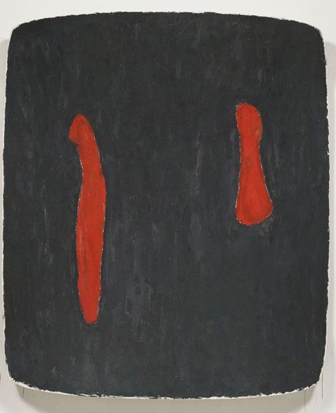 Editor: So here we have Susan Rothenberg's "Head within Head," an acrylic on canvas from 1978. The stark contrast of black against the blood-red backdrop feels very raw and primal to me. What do you see in this piece? Curator: I see a potent expression of interiority. Rothenberg, working in a predominantly male art world, used figuration in a way that challenged Minimalist abstraction without sacrificing its power. The "head within head" suggests layers of identity, perhaps alluding to the complexities of being a woman artist navigating these spaces. Editor: Layers of identity, that's interesting. I was focusing more on the rawness, but now that you mention it, the way the head is repeated, almost echoing itself, could be a visual representation of those layers. Curator: Exactly! And consider the bold, gestural brushstrokes. They aren't just about aesthetics; they're about asserting a physical presence, taking up space in a world that often tries to diminish or erase female voices. Does the red background suggest anything to you in relation to these ideas? Editor: It definitely adds to that sense of raw emotion and perhaps struggle. Was Rothenberg explicitly addressing feminist issues at the time? Curator: Rothenberg resisted being labeled a "feminist artist," but her work undoubtedly resonates with feminist concerns about the body, representation, and power. The rawness you noted might also be a response to the emotional demands and societal pressures placed on women. By not explicitly defining it, does that open a space for wider ideas around struggle? Editor: Absolutely, and I think I understand that tension between personal experience and broader social commentary better now. It's made me rethink my initial reaction to the piece. Curator: That tension is exactly where art becomes a site for critical engagement. It prompts us to question, to reflect, and to understand ourselves and the world around us more deeply.