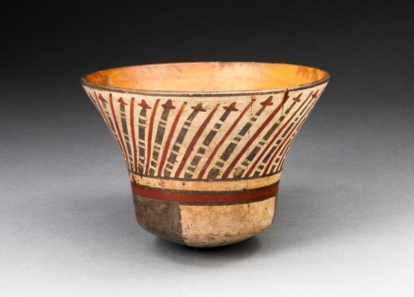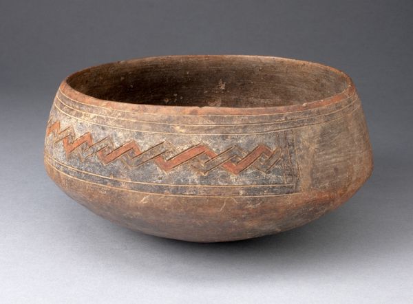Editor: This is a 16th-century Storage Jar, also called a ‘lei’, from the Xindian culture of China, made of ceramic and pigment. I notice these geometric designs near the top, almost like mountain ranges. How should we interpret a piece like this? Curator: Beyond its obvious function, a piece like this 'lei' speaks volumes about cultural dynamics. We might ask ourselves, what does it mean to create such an elaborate piece for simple storage? What’s communicated through the act of adorning an everyday object? Editor: So it’s less about what it *stores* and more about what it *says*? Curator: Precisely. It becomes a statement about identity and value. Consider the Xindian culture – a society leaving few written records. Isn't it possible objects like this became crucial forms of non-verbal communication? The specific design may denote social status, family lineage, or even ritualistic purposes beyond just storing food. The labor involved in crafting such an item suggests that preserving goods had social value intertwined with artistry. Editor: I hadn’t considered the visual language itself. I wonder what resources would have been available at that time that impacted their craftsmanship, design process and cultural impact on surrounding communities and trade. Curator: Absolutely! Analyzing available materials and the trade networks can open an interesting debate surrounding sustainability, social class and identity formation during that historical period. Food security and sustainable practices probably intersected, affecting gendered roles around farming or artisan craft-making. Editor: So we’re not just looking at a storage jar, but a vessel filled with social meaning and historical narratives! I see now how much a single piece can tell us. Curator: Exactly. The beauty of art lies in its ability to be a historical document and mirror reflecting the socio-cultural nuances of the time.