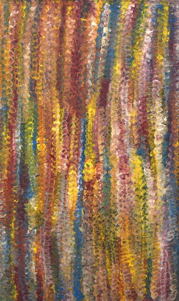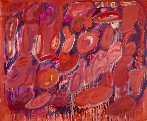 Editor: This is Emily Kame Kngwarreye’s "Merne Alhalkere" from 1993, created using acrylic on canvas. The vibrant colours and dot-like textures give the painting a joyful yet almost dizzying feel. What strikes you about this piece? Curator: It’s important to remember Kngwarreye's Anmatyerre heritage and her deep connection to the land. While it might appear abstract to some, consider how the painting embodies the alhalkere, the environment of her home. Look at the layering of colour; could this represent generations of knowledge layered upon the land itself? Editor: I see what you mean. It’s not just abstract expression, it's a representation of something real. Does her cultural background directly influence the interpretation of her artwork? Curator: Absolutely. Dismissing that is a form of erasure. For Kngwarreye, the act of painting was a ritual, a continuation of her role as an elder in her community. Her work confronts the art world with the reality of Indigenous sovereignty, artistic expression and spiritual practice intertwined. The dots themselves, though seemingly simple, represent seeds, the sustenance provided by the earth. Editor: So, we can understand this artwork as both a personal and a political statement? Curator: Exactly. Kngwarreye, in painting her connection to the land, defies a colonial gaze which sought to define and control Indigenous art. It forces us to reckon with whose stories are told, and how they're told, within the larger art historical narrative. Editor: This really shifts my perspective. I thought it was beautiful before, but now it has so much more depth and meaning. Curator: Precisely! It invites a dialogue, not just with the artwork itself, but with the historical forces that shaped it, and the voices that often go unheard.