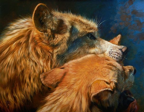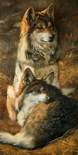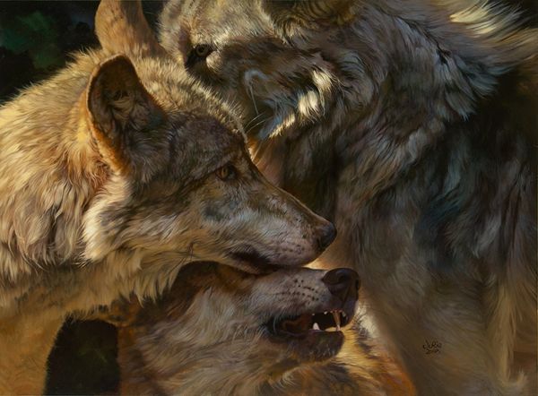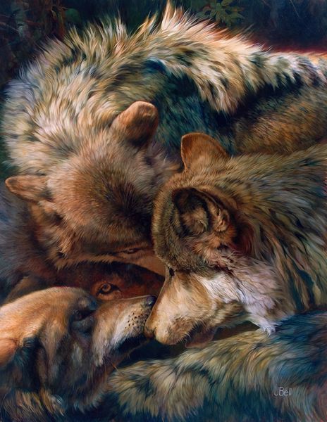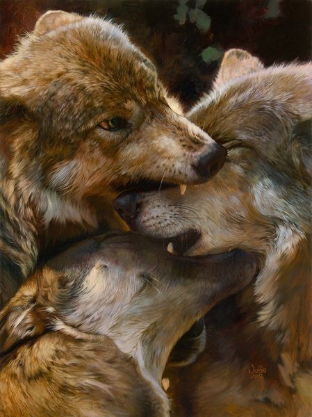 Julie Bell painted these wolves, a depiction of familial bonding, in a contemporary style. The imagery of wolves caring for each other is an ancient motif with varied interpretations. In ancient Rome, the wolf symbolized guardianship and nurturing, seen in the myth of Romulus and Remus suckled by a she-wolf. Yet, the wolf also represents ferocity and untamed nature, a duality that deeply resonates in our collective psyche. The affectionate nuzzle and lick displayed here echo across centuries, from medieval bestiaries to modern wildlife photography. This simple act of care taps into our primal understanding of kinship and community, evoking a sense of longing for connection. The image of the pack is a potent reminder of our own social bonds. This motif continues to resurface, evolving, and acquiring new meanings in different eras.