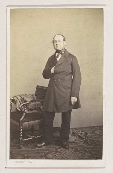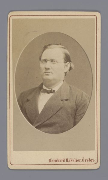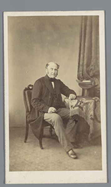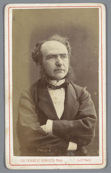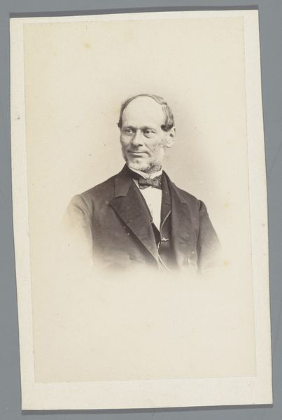 Curator: This is a photographic portrait by Bisson Frères, known as "Portret van een onbekende man," dating roughly from 1852 to 1863, crafted with gelatin-silver print on paper. Editor: Immediately, I’m drawn to the subdued palette—the interplay of muted browns and grays—it sets a tone of somber respectability. The gentleman's pose and tightly clasped hand exude an air of controlled restraint, as if guarding against any perceived emotional excess. Curator: Indeed. The somber tones typical of early photography served a function, given long exposure times; and his serious demeanor suggests much about the era’s social constraints and aspirations. What cultural stories do you think the symbols he wears carry? That small pin or medal? Editor: That small badge intrigues me. It possibly symbolizes membership to some order or recognition of service; it also offers a sharp contrast with the fluid patterns of his bow-tie, and disrupts the continuity of his lapel's curves, redirecting our sightline towards the face. And what can you say about his posture? Curator: His posture, precisely. There’s a certain stoicism embedded in that stiff bearing and firm grip that suggests not just restraint but also the burden of societal expectations of middle-class masculinity. These portraits served to declare civic duty, morality, and prosperity. The gaze feels directed but non-confrontational, conveying respectability without challenging hierarchy. The historical implications are profound. Editor: Agreed. And the compositional choice to position the subject centrally with soft focus enhances a sense of immediacy, making his stern presence very immediate, without sacrificing decorum. I can't help but notice the tonality—a kind of visual austerity that suggests that in 19th century photography, form dictated so much. Curator: Ultimately, in a relatively young medium such as photography, a lot has to do with defining what should be symbolized. And here the sitter and his choices define who he believes himself to be as a symbolic figure. Editor: Precisely, by reducing the aesthetic distractions and prioritizing the clear recording of form and light. Overall, Bisson Frères’ study encapsulates an entire cultural paradigm by merely framing this man in light, shadow, and symbolic apparel. It's very well realized.