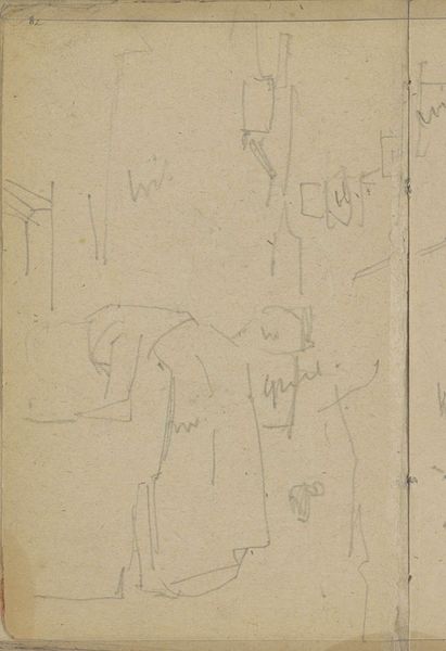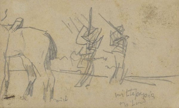 Editor: This is "Staand Paard," or "Standing Horse," a pencil drawing by George Hendrik Breitner, probably made between 1882 and 1912. It’s currently housed in the Rijksmuseum. The sketch is incredibly sparse and, I think, rather haunting. What do you see in this piece? Curator: It's interesting that you find it haunting. For me, Breitner's sketches, even the most minimal like this one, serve almost as a cultural touchstone. Consider how the horse, for centuries, represented power, labour, and even freedom. Here, stripped bare, it's a memory of those potent associations, lingering in our visual lexicon. Do you get any sense of those former connotations? Editor: I suppose so. But it's so deconstructed that the power seems… diminished. It's like a ghost of the horse, rather than the thing itself. The stark lines make it seem vulnerable, almost sad. Curator: Indeed. Perhaps Breitner, consciously or not, captures a shift in perception. As industrialization progressed, the symbolic weight of the horse began to change. The drawing marks an intriguing intersection - the fading of one symbolic order and the uncertain emergence of another. Look at the way the sketch almost blends into the paper. Editor: Yes, it’s very faint, like he was trying to capture something fleeting. Curator: Exactly. Think of the sketch as a moment of cultural remembrance, preserved in graphite. What was once vibrant and integral is now a study in memory and absence. Do you think it matters that he never "finished" this drawing? Editor: It adds to that feeling, doesn't it? As if the memory itself is incomplete, fading over time. Curator: Precisely. We see a cultural narrative shifting before our very eyes, and through a humble sketch, Breitner invites us to contemplate those changing symbols. It has certainly given me much to ponder regarding our relationship to these cultural carriers. Editor: Me too! I initially saw only a simple sketch, but now it speaks volumes about cultural memory.