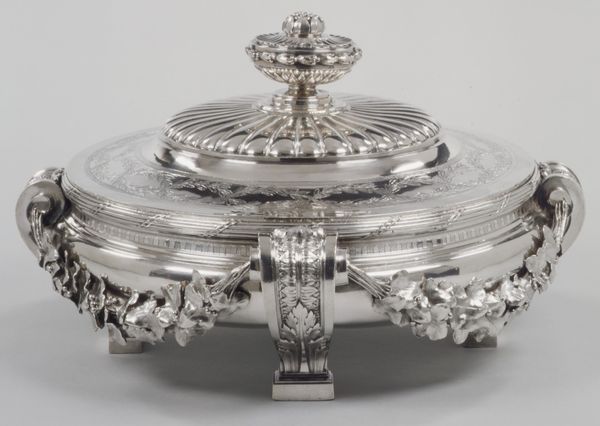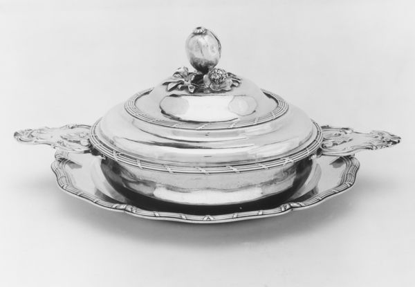 Curator: Oh, it's undeniably elegant. The silver practically shimmers. Editor: True, the texture catches light beautifully, although there is something inherently excessive about this kind of adornment. Curator: I understand the sentiment, but perhaps "excessive" is merely a reflection of its time. This is a "Broth bowl with cover and stand," part of a travelling set crafted by Louis Imlin III the Younger in 1768. A quintessential example of Rococo decorative art now housed at the Metropolitan Museum. Editor: Rococo, alright. The eye is immediately drawn to the acanthus leaves and that sculpted artichoke on top! Form over function, wouldn't you say? All those curves and flourishes. It definitely feels… theatrical. Curator: The artichoke speaks volumes though! Consider its symbolism throughout history— fertility, abundance, hope... A sign of privilege, surely. It says, "I am wealthy, secure, and prepared to share this bounty.” Think of what that imagery would mean to the original owner on the road. It declares, ‘luxury can travel.’ Editor: But does that declaration need so many swirling tendrils etched into the surface? From a structuralist standpoint, I appreciate how all the elements play into each other, reflecting and reiterating motifs... however it feels more of a status symbol than a truly moving work. Curator: Indeed, such bowls held warm, comforting broths— nourishment on long journeys, or relief during times of sickness, symbolizing care and connection when far from home. Beyond mere wealth, these are cultural narratives, emblems of stability in transit. Editor: I suppose I can grant it that. This era saw utilitarian items elevated to artworks through detailed construction and historical allusion. Its value comes, as much, from the craft that is in effect, sculpting a memory for a family, as much as holding liquid nourishment for someone travelling far from home. Curator: Precisely. We often dismiss the decorative arts as mere ornamentation, failing to recognize their symbolic language— how they encode histories, social roles, and cherished hopes. It transforms something functional to being representative of familial values, and historical context. Editor: Well, you've certainly given me something to chew on, more than just a bowl of broth. Curator: Always a pleasure to connect these historical threads. There's real comfort in identifying what matters between each other.