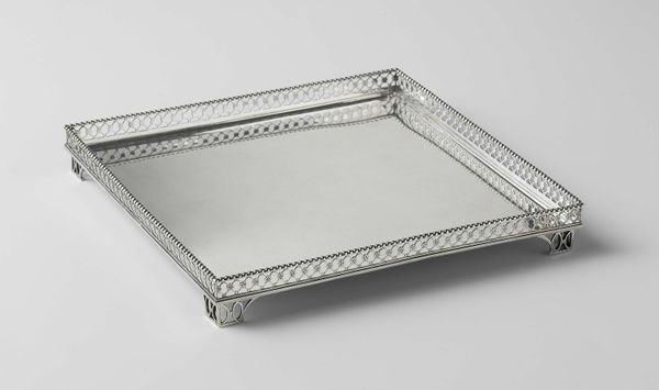 Editor: Here we have a Dutch Baroque silver inkstand made between 1725 and 1750 by Jurriaan van Kalker. Its geometric form contrasts with the ornate feet. It feels… contained, somehow. What do you make of it? Curator: This inkstand, made of precious metal, reveals much about the priorities of the Dutch East India Company's elite. The very material speaks of global exploitation; the silver likely extracted through colonial labor. It demands we look at decorative arts as enmeshed in broader power dynamics. Editor: Power dynamics, how so? Curator: Consider its intended function. Writing was power. Who had access to it? Who was being written about, and from what perspective? Objects like these weren't merely decorative; they were tools for solidifying colonial authority and shaping narratives. Who benefitted from those narratives and who was disadvantaged? Editor: I see. So it's not just about aesthetics, but about access and representation? The wealth is used to produce these tools for… official communication. Curator: Exactly. And the “Batavia” referenced in the name isn't accidental. It's a direct link to the violent colonial history of the Dutch East India Company. An attempt to validate this project in the Dutch Golden age by linking the homeland with the colonized land through symbols and objects, embedding the inkstand itself into this history of exploitation. Does it feel differently now? Editor: It does. Knowing the backstory gives this decorative object a very different, almost unsettling character. It goes from seeming austere to screaming out wealth extracted from someplace far away. Curator: It’s a stark reminder that aesthetics and ethics are intertwined.