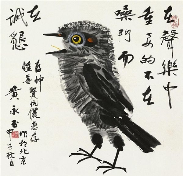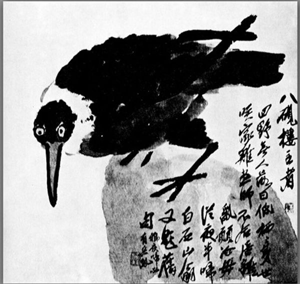 Editor: This is Qi Baishi’s “Bird in a Tree,” from 1895. It's stark, isn't it? Just the bare essentials of ink on paper. It feels almost weightless, suspended in all that negative space. I’m struck by how economical it is, so much conveyed with so little. What's your take? What do you see when you look at it? Curator: It whispers of worlds unseen, doesn't it? All that white space isn't empty; it's charged with possibility, with the unsaid. Qi Baishi often explored themes of nature and simplicity, turning the ordinary into the extraordinary. I see a dance between solidity and emptiness, a bird perched not just on a branch but on the very edge of silence. It almost feels like the bird might take flight into the viewer's imagination. Editor: The silence is palpable! It’s as though any extra brushstroke would have been too much noise. The bird is the heavy dark weight on one side, contrasted with empty space. It is beautiful in its asymmetry. Curator: Exactly! The asymmetrical balance gives the piece its dynamism. Qi Baishi masterfully directs our gaze with just a few, perfectly placed strokes. Think of it as a visual koan, a riddle posed not in words but in ink. How do you think its starkness plays into its message? Editor: Perhaps it's about finding beauty in the simplest things, or appreciating the quiet moments? Maybe it’s not about what's there, but what *isn't*. I also see this image of one standing at life’s precipice, making tough decisions! Curator: I love that interpretation. It echoes Qi Baishi's own journey – his late embrace of art and his determination to forge his own path. This small bird suddenly contains a universe of meaning. Editor: Absolutely, a universe held in perfect, quiet balance! The limitations actually create powerful results. Curator: And that’s the magic, isn't it? Seeing infinity in a grain of sand, or a universe in a little bird sitting on a twig.