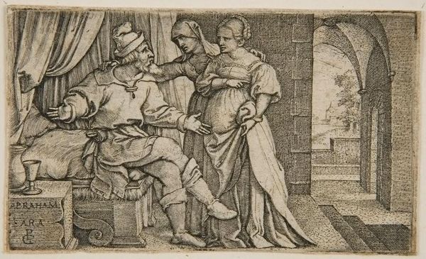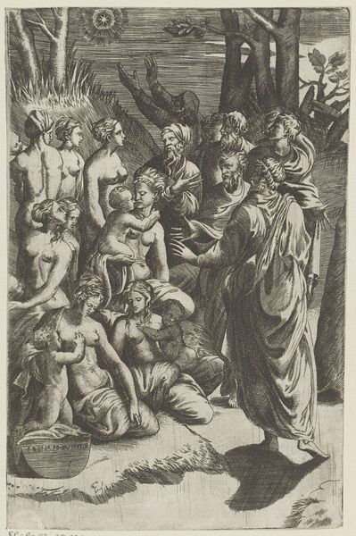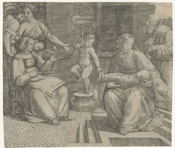 Editor: This is a lovely, miniature etching titled *Christ Blessing Little Children* by Georg Pencz, dating back to the 16th century. The tenderness with which Christ cradles the children is what initially strikes me. What do you see in this piece? Curator: A tiny world, isn't it? Pencz crams so much life and detail into just a few inches. I see a reflection on family, community, and grace. The scene, bathed in soft light and shadow, feels almost like a dream – a quiet moment plucked from the frenzy of the everyday. And I'm drawn to the subtle gestures: the protective embrace, the curious gaze of the children. Editor: The architecture in the background is interesting too. I never would have thought an artist would include that detail. Curator: Exactly. Pencz is inviting us to consider the setting, reminding us that even the most intimate moments are shaped by the world around us. These scenes also act as a reminder of simple values. Editor: I see what you mean. It makes you think about what really matters, even today.
