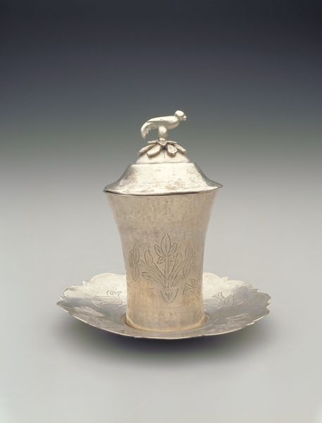 Curator: Here we have a silver chamber candlestick, also called a taperstick, crafted between 1809 and 1810. It is attributed to Rebecca Emes, and is an excellent example of Neoclassical decorative art. Editor: It feels rather lonely, doesn’t it? Something about its diminutive scale and tarnished surface speaks to quiet, perhaps unseen moments. Curator: Precisely! Its compact form and meticulously crafted details reveal a preoccupation with form and utility characteristic of the Neoclassical style. Observe the fluted stem, the square base with its delicate floral motifs, and the circular handle for ease of carrying. Each element adheres to a clear, geometric order, conveying a sense of refined simplicity. Editor: Yet the “simplicity” of Neoclassicism often glosses over the social realities that made such refined objects possible. Whose labor went into mining, processing, and crafting this silver? Who would have been privileged enough to use it, perhaps late at night to pen letters that further consolidated power? Curator: An important perspective, and it reminds us to consider the context of luxury and artistry. What draws my eye is the interplay between function and ornamentation. The handle, for example, isn't merely a practical addition; it also features a decorative shell motif that echoes the ornamentation found along the edge of the base. Editor: The handle's placement and size also feel deliberately feminine. Candlesticks such as this would have enabled genteel ladies to retire from communal spaces and retreat for private time alone with a book, their thoughts, or in letter correspondence. Curator: Absolutely. The piece as a whole exudes that tension, embodying the period's ideals of both utility and aesthetic refinement. Editor: Considering the era of production, this small chamberstick feels very loaded, very telling. It speaks volumes about status, labor, and perhaps even gender. Curator: I appreciate how our diverse viewpoints have shed light on different facets of this unassuming artifact. Editor: Yes, it really underlines how a deeper exploration reveals even greater complexities.