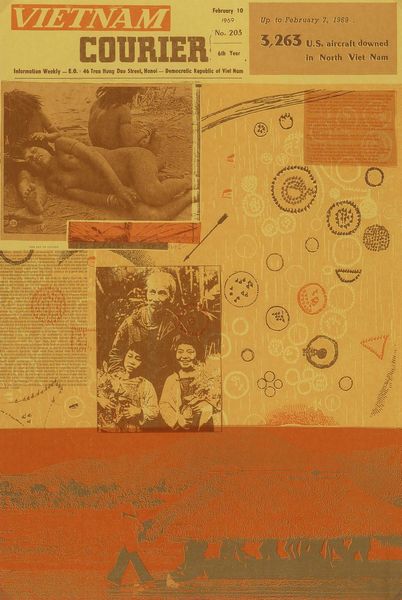 Editor: This is Joe Tilson's "Let a Thousand Parks Bloom." It's quite a striking image, with the juxtaposition of vibrant colours and stark black and white photos. What's your take on the meaning behind the materials and images used? Curator: Notice how Tilson combines screen printing, collage, and photography. It's a critique of how materials circulate and how images are consumed. The militaristic imagery, the hand reaching through a fence – it’s all about control of resources and the cost of societal production, isn't it? Editor: So you see it as a commentary on the social context of its creation, the labor involved? Curator: Precisely. The title itself is ironic, set against imagery of conflict. It forces us to confront the production and consumption that underpin our societal ideals and the inherent inequalities within them. Editor: That's a perspective I hadn't fully considered. Thank you!