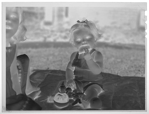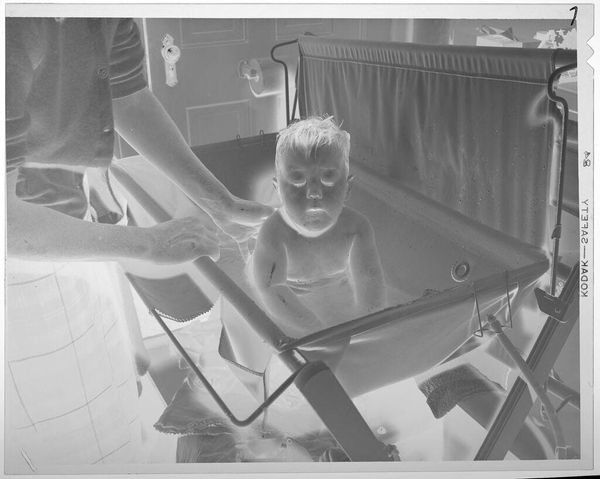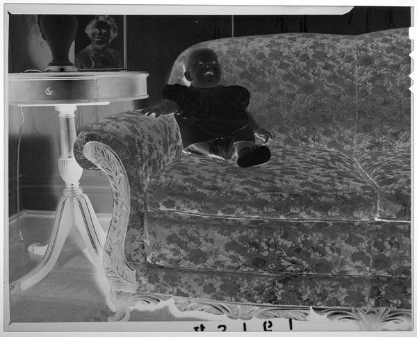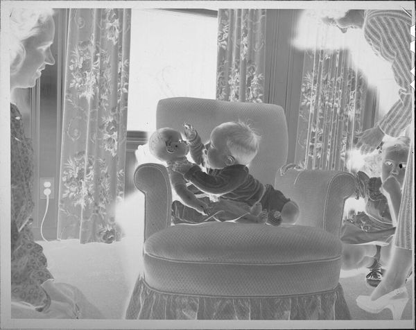 Curator: What strikes me about this image is the stark contrast between the ornate couch and the seemingly candid moment captured. Editor: Indeed. This photograph, currently titled "Untitled (baby posed sitting on ornate couch as grandfather looks on)," was taken by Martin Schweig. The composition creates a fascinating dialogue between generational experiences. Curator: It speaks to the complex relationships between family members, especially within the power dynamics of age and heritage. The baby is centered, almost like an emblem of the future, observed by a figure who represents the past. Editor: The use of light and shadow also directs our gaze, focusing on the textures of the couch and the expressions of the figures. Notice how the soft focus gives the image a dreamlike quality. Curator: It also hints at societal expectations placed on children and families. The formal setting contrasts with the baby’s natural, unscripted presence, reflecting how societal norms often shape our understanding of childhood and family roles. Editor: It’s compelling how a simple photograph can evoke such layered meanings. The interplay of elements engages us in a deep visual and social analysis.
