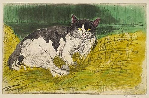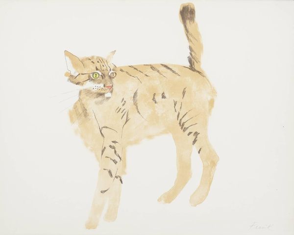 Editor: Here we have "Cat," a 1981 watercolor painting by Mary Fedden. It has such a light, almost ephemeral quality, with those delicate washes of color. I’m curious, how does this artwork sit within a broader historical context, what stories might it tell about art and society at the time? Curator: Fedden worked during a fascinating period, where ideas about the domestic, the personal, and the feminine were gaining increased visibility within art discourse. Though her style is often perceived as simply 'charming' there’s a sophisticated understanding of the domestic space, specifically through how that connects with art. A painting like this can be considered a political act—a subtle claiming of the right to represent personal and often female-associated spaces. It asks the question of how something often overlooked is finally elevated. Do you see hints of that claim reflected in how this art work differs from others of its type at this time? Editor: That's interesting. I guess I hadn't considered the act of depicting everyday life itself as something almost rebellious or at least a push back against traditional male dominance in painting, the gaze if you will. Is that why she focused more on personal things, in order to empower feminine issues? Curator: Exactly. Artists like Fedden helped pave the way for a greater acceptance and validation of a wider range of subject matter and perspectives. So the cat, here, is a very deliberately placed piece. Editor: It’s so interesting to consider how a seemingly simple artwork is actually steeped in social commentary. Curator: Absolutely. I've also grown to look at everyday art more acutely and through Fedden's work am finding my new artistic voices.
