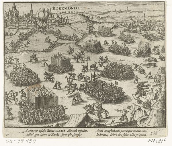 Curator: We're looking at "Beleg van het eiland San Michele bij Malta," or "Siege of the Island of San Michele near Malta," an engraving by Antonio Francesco Lucini, dating back to 1665. Editor: It's striking how chaotic yet organized it feels. A frenzy of tiny figures amidst a rigidly constructed landscape. The crosshatching gives the whole scene a dark, anxious energy, doesn't it? Curator: It is quite detailed. Consider the labor involved in producing such an intricate print in the 17th century. The physical act of engraving those lines, the tools required, and the social context of its creation as a historical record for consumption… Fascinating. Editor: Indeed. Look at how the island is depicted: a fortress crowned by symbols of power and resistance, figures locked in battle. There's such clear visual storytelling, a very deliberate symbolic structuring of the conflict. Curator: And it also showcases early printing technology’s capacity for mass production of imagery, influencing public perceptions of military events. This wasn't just art; it was information dissemination on a grand scale. Editor: It's more than just a news report; it's an emblem of the baroque aesthetic. The sheer density of the visual field, overflowing with details, reinforces the image's sense of drama and the period's theatrical sensibility. Each flag, each weapon, contributing to an overall symbolic tapestry. Curator: Right. So, we have here a combination of artistic skill, artisanal technique, political messaging, and commodity exchange… Editor: I am fascinated by how Lucini transformed a real-life siege into an iconic visual narrative, how specific symbols evoke particular cultural meanings even centuries later. Curator: Examining this engraving reminds us that art and historical records are never neutral; they're always constructed, contingent upon material and social forces. Editor: And embedded with visual codes and cultural narratives that continue to resonate through time. A great print indeed!