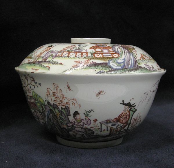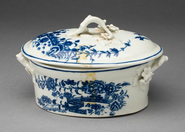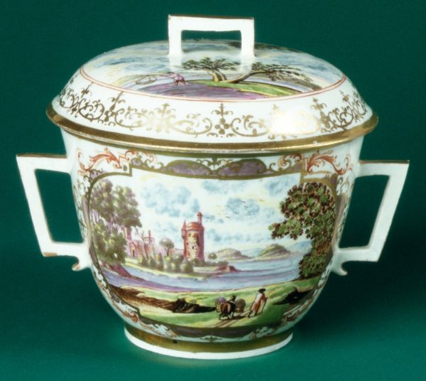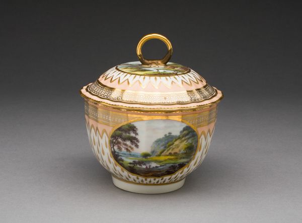 Editor: Here we have "Bowl with Cover", crafted between 1765 and 1770 by the Le Nove Porcelain Manufactory. It's porcelain, so it's hard, white and ever so smooth. The decoration... well, it reminds me of a playful theatre set, quaint and utterly charming! What jumps out at you? Curator: Theatre! Yes, that's a delightful way to see it. To me, it's like stumbling upon a tiny, self-contained world. Rococo was all about embracing the fanciful and escaping into idyllic scenes, wasn't it? Think of these landscapes not just as depictions of nature but as carefully staged backdrops for elegant, leisurely pursuits. Doesn’t the overall form hint at something luxurious – maybe even a little bit naughty? Editor: Naughty? Really? Curator: Well, think of what it might have held - perfumed oils? Sweetmeats for secret rendezvous? This isn't about mere utility; it's about indulging the senses. And the slightly naive rendering of the buildings gives the scenery an innocent feel! Don't you get the sense of playful abandon? Editor: I see your point! The landscapes, while decorative, also feel surprisingly personal. Almost like a dreamscape. The choice of the rosette knob and flamboyant handles creates the luxurious and slightly mischievous sensibility you mentioned, transforming a simple container into a objet d'art. Curator: Precisely! It all melds together to give this piece an irresistible energy and sense of personal fantasy, wouldn't you say? Each of these features contributes to its distinctive character! Editor: Absolutely. It's made me see this decorative bowl not just as a pretty object, but as a window into a mindset, a period’s way of seeing the world and themselves, almost! Thanks!