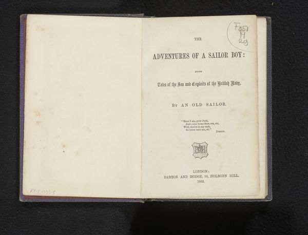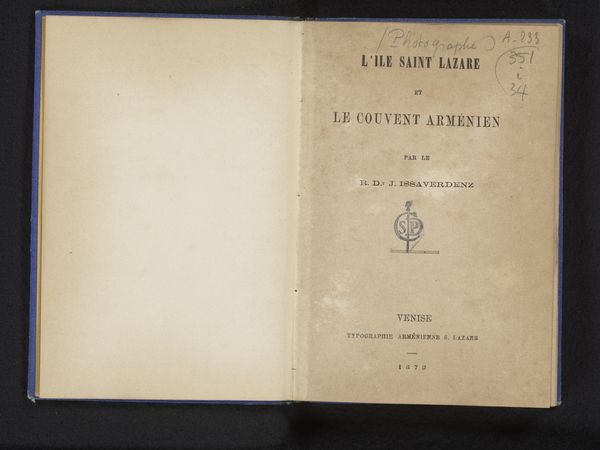 Curator: What immediately strikes me is the color palette—the muted reds of the book's binding against the cream-colored pages creates such a harmonious contrast. Editor: This is a view of an open book, dated to 1880: *Die Insel S. Lazzaro bei Venedig und das darauf befindliche armenische Kloster*, or, *The Island of S. Lazzaro near Venice and the Armenian Monastery Located There*. Curator: The typography, too, draws the eye. Look at the different weights and sizes used for emphasis. There's an undeniable rhythm to the page design that evokes an echo from the traditions of religious text. Editor: Absolutely. And thinking of that rhythm, let's consider the sociopolitical landscape when Jacob Issaverdenz composed this historical sketch. It depicts San Lazzaro degli Armeni, an island that has been a significant site of Armenian culture since the 18th century. This book then represents the Armenian diaspora, serving as a critical vehicle for cultural preservation and identity formation within the shifting dynamics of the time. Curator: I see how it functions as a cultural object, and focusing on materiality further informs my view. The crisp edges of the paper and clear printing demonstrate the dedication and skill poured into its production, imbuing this artifact with its significance. Editor: Precisely, because this particular book testifies to the cultural resistance that has long played out at the intersections of religion, nationality, and displacement. How does seeing its historical significance shift your immediate impressions, would you say? Curator: Understanding that larger historical context provides depth; what I thought of as a simply elegant design element is now an assertion of cultural identity and continuity. I love how its stark beauty and visual presence also embody political resistance. Editor: It serves as a compelling reminder of art’s intersection with historical events. The design may be minimalist but the weight of its existence as both text and testament lends incredible power.