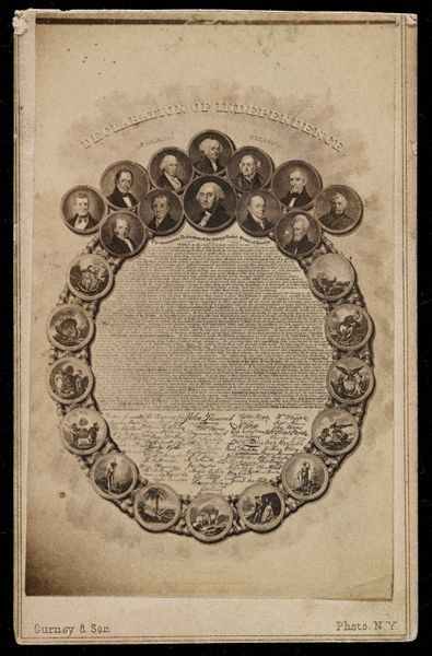 Editor: Here we have an anonymous collage from between 1851 and 1878, titled “Collage van miniatuurportretten, in het midden paus Pius IX en daar omheen diverse kardinalen"—a mouthful! It's ink and print on paper, featuring what must be dozens of portraits arranged in an oval. The whole thing feels rather formal and imposing, like a class photo from a very exclusive club. How do you interpret this work, especially given its historical context? Curator: This piece speaks volumes about the visual strategies employed by institutions to consolidate power and project an image of unity. Consider the placement of Pope Pius IX at the center: it reinforces a rigid hierarchy. This wasn't merely a group photo; it was a carefully constructed image designed to assert the authority of the Catholic Church during a period of significant social and political upheaval. Think about the unification of Italy happening during this period, challenging papal power. Editor: So, it's less a celebration of individuals and more a statement about the institution? Curator: Precisely. The repetition of portraits, almost like a visual litany, works to create a sense of overwhelming, unwavering strength. How do you think the artistic choices, like the monochrome palette and the printmaking technique, contribute to this message? Editor: It definitely adds to the serious tone, giving it a timeless quality, almost like a historical document. If it were in color, it might feel very different. Curator: Exactly. By stripping away color and embracing the reproducible nature of printmaking, the collage suggests an immutable and universally accessible truth, reinforcing the Church's doctrines. And how do you perceive the arrangement, that rigid structure? Editor: It's like they are all aligned to him. It does convey power. It really makes you think about the subtle ways images can communicate ideology. Curator: Indeed. This collage, far from being a simple collection of portraits, serves as a powerful visual argument for the enduring authority of the Catholic Church in a rapidly changing world, prompting us to consider the visual tools of power. Editor: That’s a great way to understand it; thanks for sharing that perspective.