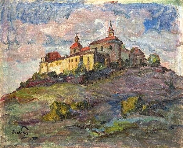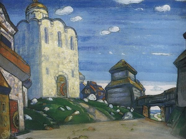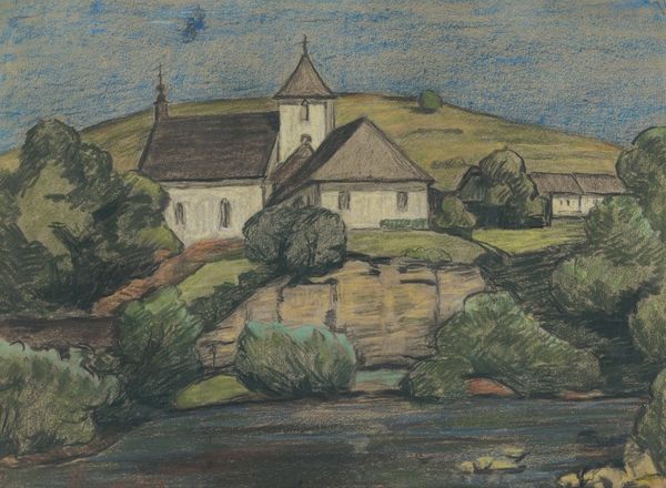 Curator: Good morning. We're standing before Walther Gamerith's "Landschaft mit Kirche und Dorf," created around 1922. The work employs watercolor, colored pencil, and oil on paper. Editor: It feels…quiet. There's a subdued quality to the color palette that invites introspection. The muted greens and greys create a sense of stillness, don't you think? Curator: Absolutely. The application of the paint and the texture of the pencil strokes certainly reinforce this stillness, even within what is recognisably an Expressionist mode. There's a definite reduction of form to its essence. It is Expressionist in that the work is concerned less with visual realism, and more with the artist's feeling-state at the moment of production. Editor: Yes, and what I appreciate about the handling of the scene, viewed through this Expressionistic lens, is its historical situation. Remember that after the collapse of the Austro-Hungarian empire, rural life underwent drastic change and a certain decline, particularly with industrializing hubs exerting ever greater social pressure. Paintings like these helped create a shared sense of identity amidst a changing landscape. It allowed for the rural population to not only picture itself, but, I’d argue, re-imagine its importance within a drastically modernizing Austria. Curator: That is astute. It certainly adds layers of complexity, which you can view via the formal elements here, the contrast between the grounding earth tones and the sky, how one seems to pull at the other formally. The impasto of the village versus the smooth surface of the cloudy skies above it…It underscores the tension of modernizing forces at work, even as one could argue the church looms highest of all, mediating between earthly village and divine sky. Editor: Perhaps Gamerith hoped the painting would operate something like a portal, allowing modern city viewers an entry-point into an important sense of their quickly dissolving heritage and folk identity. In the way the church visually holds court, so too would heritage for Austria at the time. Curator: Fascinating points. Looking at it again with those factors in mind, I now see an intriguing ambiguity. Editor: Yes. A reminder, then, of art’s capacity to capture transient historical anxieties. Curator: And it presents a unique, if understated, contribution to the evolution of landscape painting.