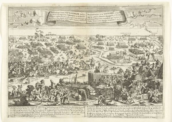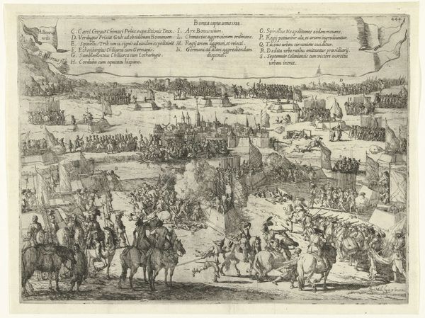 Curator: Looking at this engraving from between 1649 and 1651, titled "Maastricht veroverd door Parma, 1579," I am immediately struck by the incredible detail. It’s attributed to an anonymous artist and held at the Rijksmuseum. The lines seem almost endless, creating this chaotic, energetic cityscape overtaken by military activity. What's your initial reaction? Editor: The sheer density of figures is quite overwhelming! It speaks to a need to document and perhaps even glorify military strength and conquest. Beyond the immediate scene, the way the image is constructed—this etching and engraving technique—seems deliberately aimed at widespread reproduction and dissemination. Think about the labor involved. Curator: Precisely! This wasn't a quick sketch; there was significant planning and technical skill invested. The process is what creates its accessibility. But zooming out, the depicted event itself, the siege of Maastricht in 1579, marked a critical moment in the Eighty Years' War, framing the socio-political narrative. This print would have been a potent piece of propaganda, shaping public opinion. Editor: Propaganda is definitely at play here, and thinking about reception is key. This image isn't just recording history; it's *making* history by constructing a certain version of events. The composition emphasizes Parma's forces, creating a sense of order amidst the chaos of war. What was the experience of consuming it back then? Who could even access and comprehend it? Curator: We can surmise the market would include wealthy merchants, nobles, or governmental entities interested in chronicling and visualizing their victories. Let's also note the deliberate focus on linear details achieved by etching: geometric buildings contrast with rounded organic shapes that constitute the city and terrain. Editor: I am looking at the pen illustration style; there’s a commitment to realism—however idealized—through meticulously rendered detail. It begs questions about the economics of image-making at that time. Who was commissioning works like these, and what was the scale of production? And it's a beautiful contrast—the brutality of warfare expressed through a delicate, painstaking artistic technique. Curator: A beautiful paradox. Examining the materials—the paper, the ink, the printing process—allows us to better understand the socio-economic landscape in which this work was produced and circulated, offering a lens through which we can re-evaluate these historic conflicts. Editor: Agreed. Analyzing this print allows us to access layers of cultural meaning encoded not just in its subject matter but also in the materiality of its production and the mechanics of its distribution and reception.