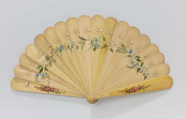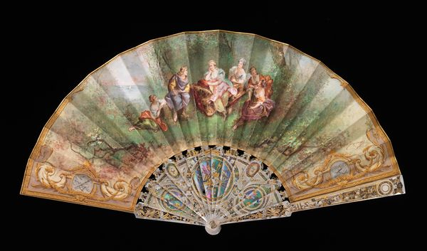 Editor: Here we have an exquisitely painted folding fan, crafted around 1775-1780 by an anonymous artist. The watercolor scene atop a mother-of-pearl frame depicts a joyous outdoor gathering. The whole object evokes a feeling of aristocratic leisure, of playful elegance. What strikes you most when you look at this delicate scene? Curator: Ah, yes, the whisper of silk and the click of pearl! To me, it’s a captured moment— a fleeting glimpse into a world obsessed with artifice and pleasure. Look at the scene – the dancers, the musicians. The scene feels light-hearted, but almost too picture-perfect to be natural. Editor: So, you're saying that the casual atmosphere is staged? I'm curious about how the fan itself contributes to this sense of performative elegance. Curator: Exactly. This fan isn't just a pretty accessory; it’s a statement, a prop in the grand theater of 18th-century high society. I find it endlessly fascinating how these decorative objects offer hints about lives lived with an acute awareness of being seen, and judged! Isn't it strange how something designed to be used as relief from summer's heat ends up feeling… so studied? Editor: That's such an interesting perspective! I hadn't considered the performative aspect of even owning such a decorative object. Curator: Indeed. It makes you wonder, what secrets were hidden behind these painted smiles? What truths were concealed by the fluttering of such fans? Editor: Well, I'll definitely be looking at fans differently now, understanding them not just as pretty objects, but as artifacts imbued with meaning and social commentary.