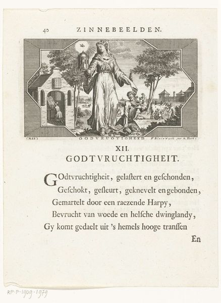 Editor: This is an engraving from somewhere between 1681 and 1737, attributed to François van Bleyswijck, called "Emblem with Allegory of Servitude". The figure is so serene, almost dreamlike. How would you interpret its meaning within the context of the time? Curator: It's interesting you mention the dreamlike quality. Allegories like this served a vital role in communicating moral and political ideas during the Baroque era. It wasn't just about artistry; prints like these actively shaped public perception and reinforced societal norms. The "Servitude," which we might see negatively today, was then viewed through a different lens. Editor: How so? Was servitude considered a virtue then? Curator: Within a social structure deeply rooted in patronage and obligation, "servitude" was a way to describe loyal service and civic duty, concepts deemed essential for societal harmony. Think about the Dutch Republic's emphasis on order and the roles everyone played. This print promotes a social contract, suggesting that diligence ensures collective prosperity. Editor: So, the figure isn’t necessarily a slave, but representing someone dutiful? How would the museum context have further shaped interpretation of prints such as this at the time? Curator: The museum at the time would most likely be the private collection of a noble or a scholarly society, serving to reinforce their power and cultural capital. Collecting and displaying these images became a way of defining "good" civic behavior, emphasizing this interpretation. Therefore, the power of such art lies not only in its beauty but also in how it molded ethical considerations in society. Editor: That’s a side of Baroque art I had not considered. It is a window into the period's moral compass. Curator: Indeed, viewing art in its social framework illuminates the intended, often didactic, purpose behind seemingly simple imagery.